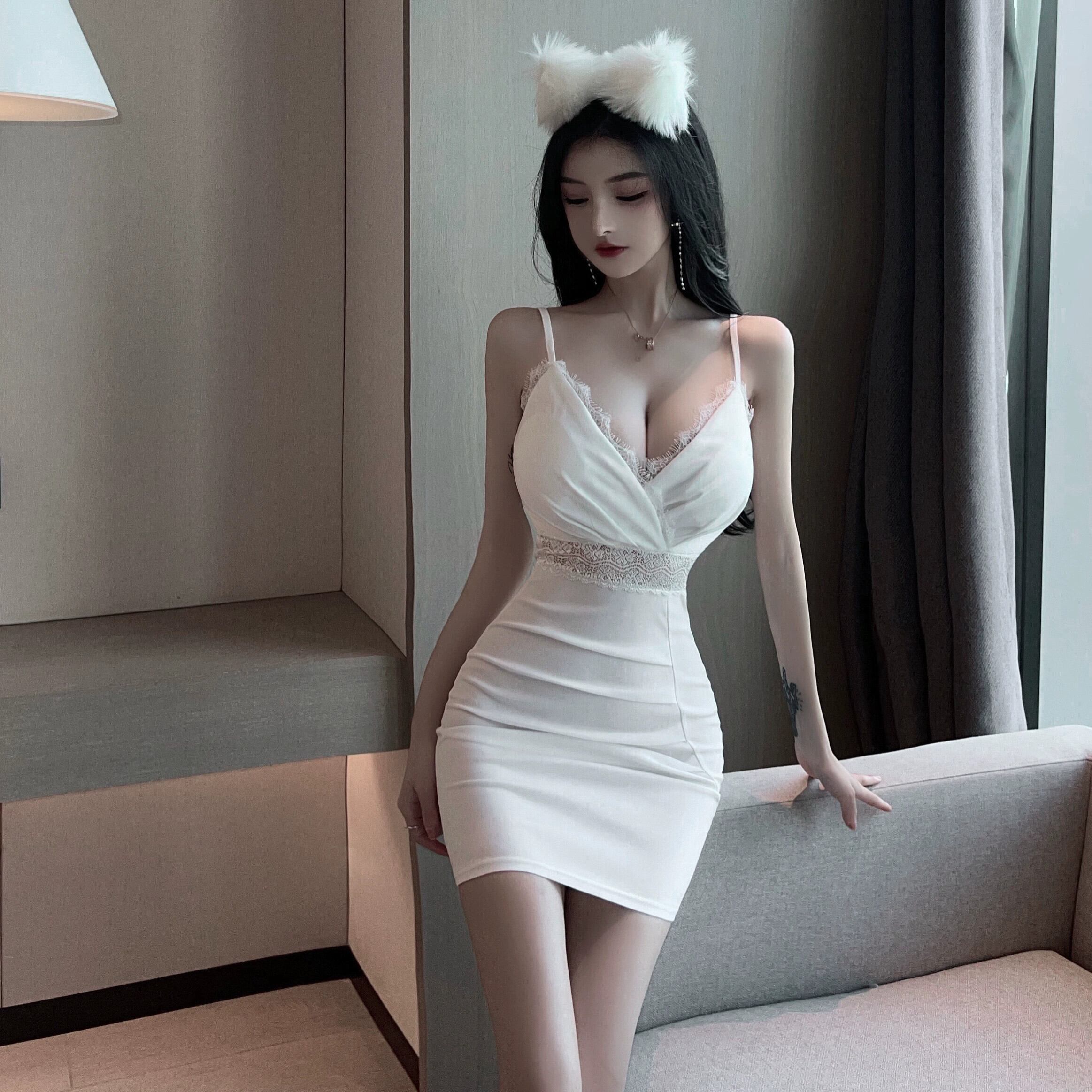 ナイトクラブセクシーな女性の夜の作業服ローカットディープ V プロフェッショナルウェアショートスカートレースステッチサスペンダードレス yeyij15882015218