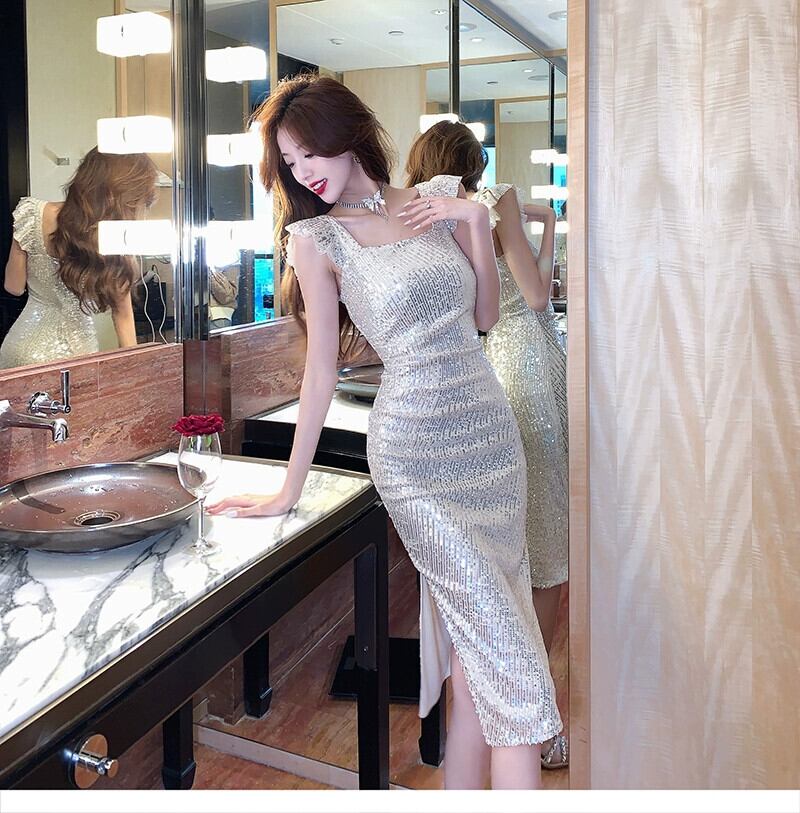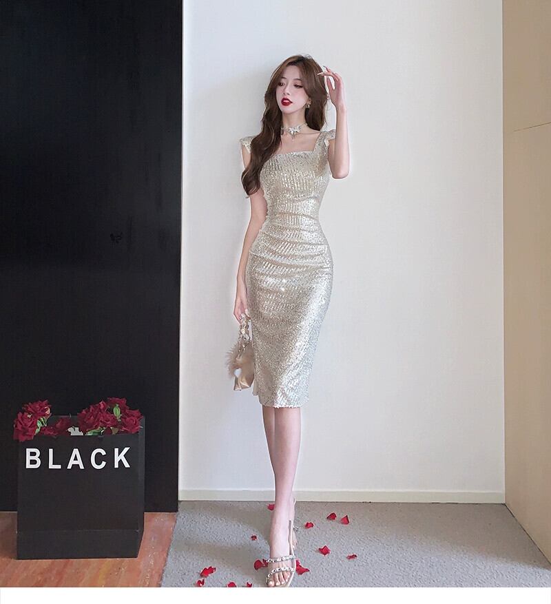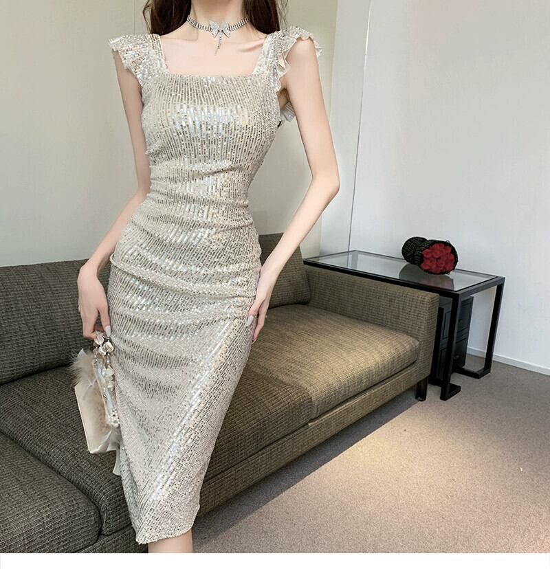 フレンチイブニングドレスハイエンドライトラグジュアリーニッチ気質セレブハイエンドスリムスパンコールミッドレングスサスペンダードレス yeyij15966622365