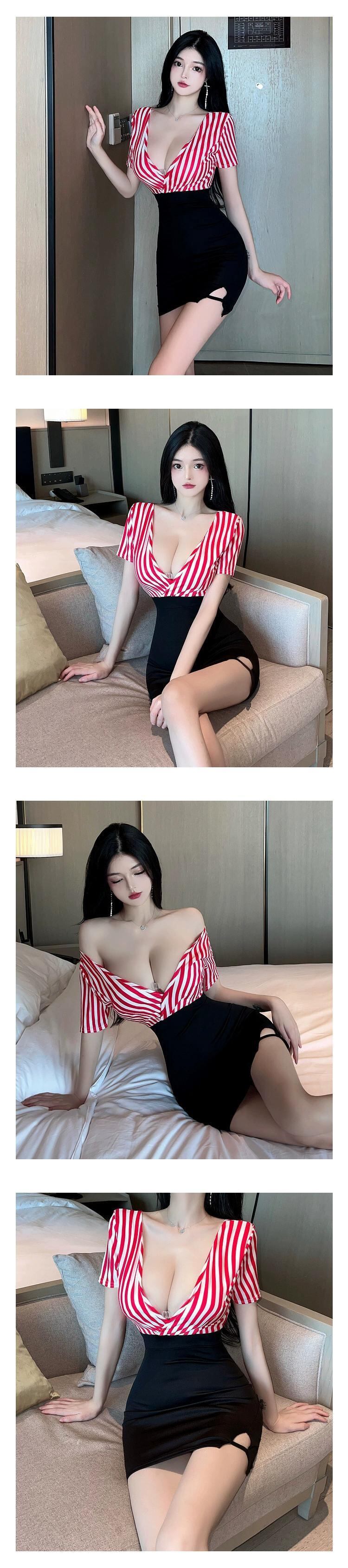 ナイトクラブの女性の夜の作業服技術者作業服セクシーなローカット V ネックストライプステッチ半袖ドレス Vネック yeyij58805568347