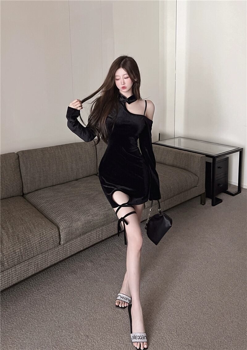 ライブ服女性アンカー pogenic 秋の若いゴールド ベルベットのセクシーなワンショルダー オフショルダー チャイナ ドレス オータム 秋物 yeyij87225126669