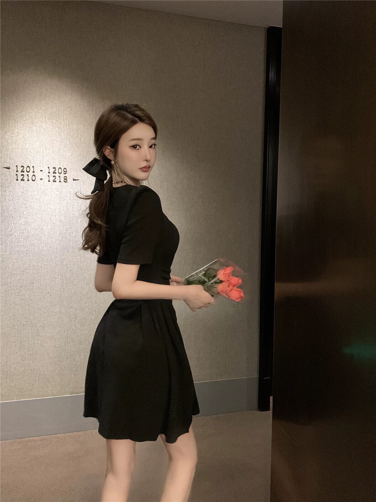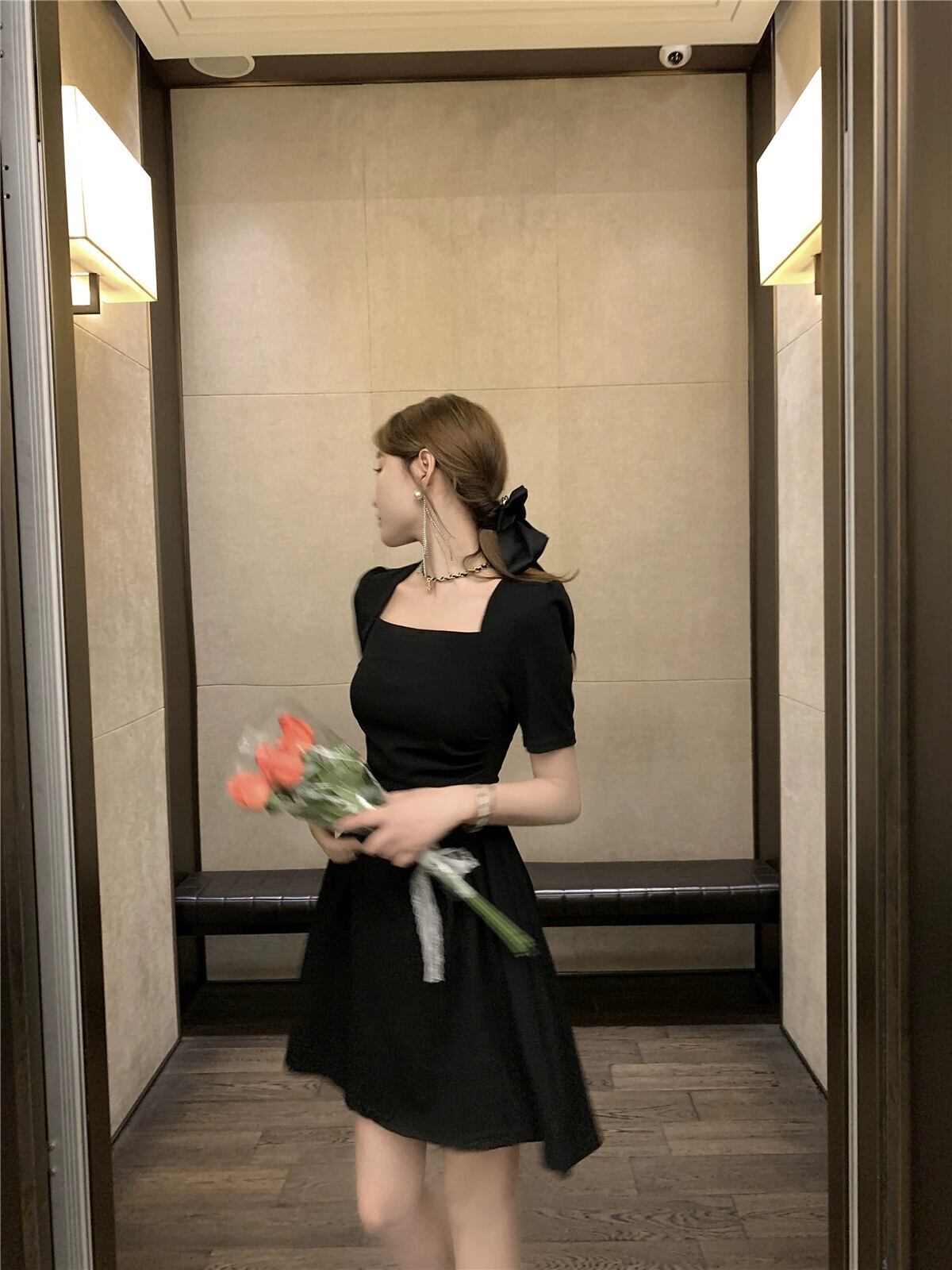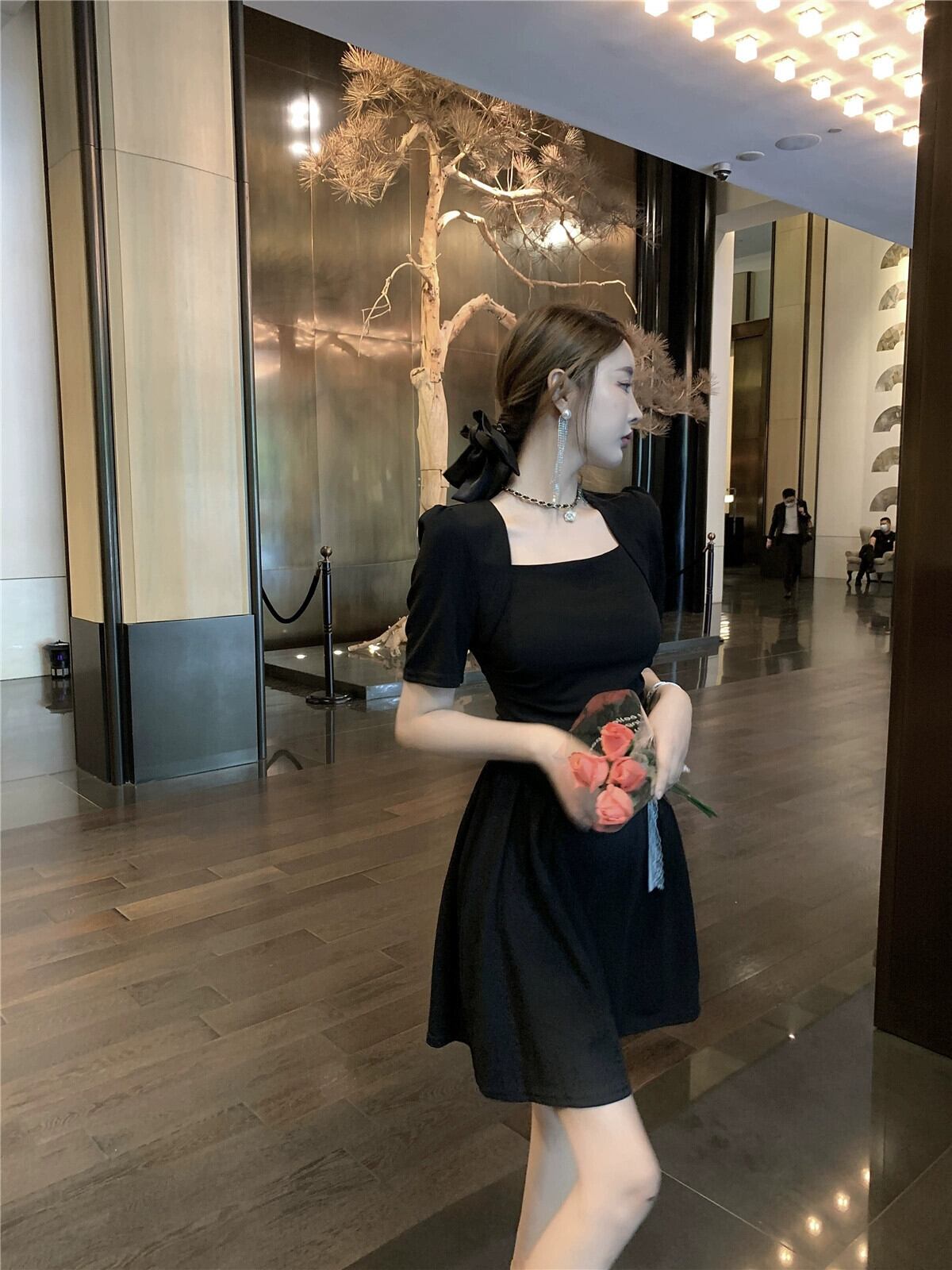 フレンチヘップバーンスタイルリトルブラックドレスの女性の夏のハイエンド感覚ウエスト痩身セクシーなスクエアカラー半袖ドレス サマー 夏物 スクウェア yeyij35932100814