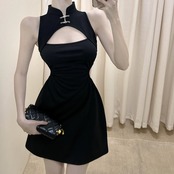ライブ服女性アンカー pogenic 若いセクシーな黒のノースリーブ中空改良されたチャイナ ドレス ブラック yeyij16576138895