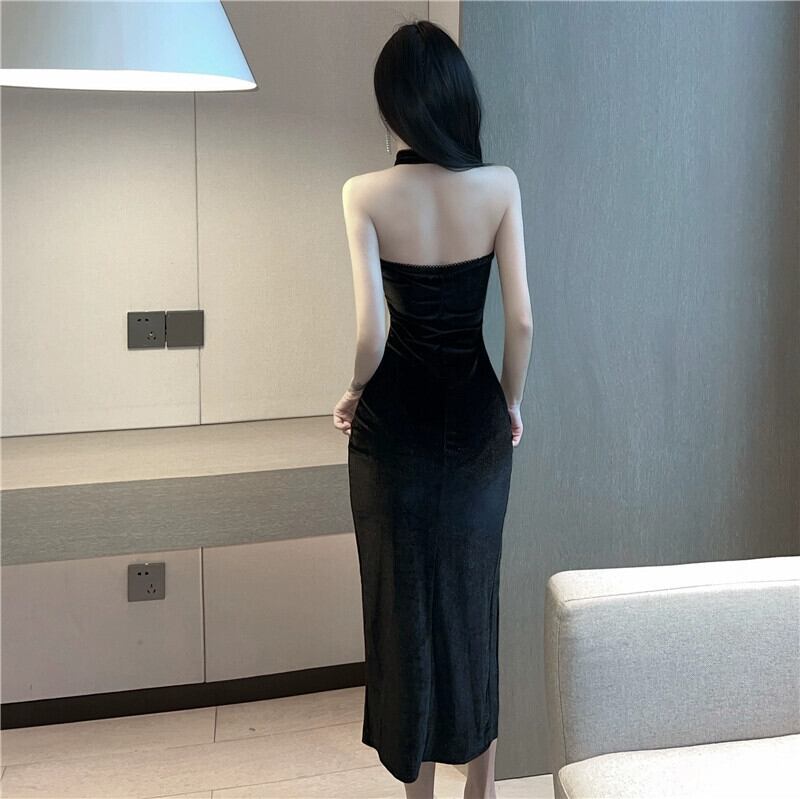 黒修正チャイナドレスイブニングドレスナイトクラブナイトクラブ女性のナイトクラブセクシーなレースステッチミッドレングスドレス ブラック yeyij17662289242