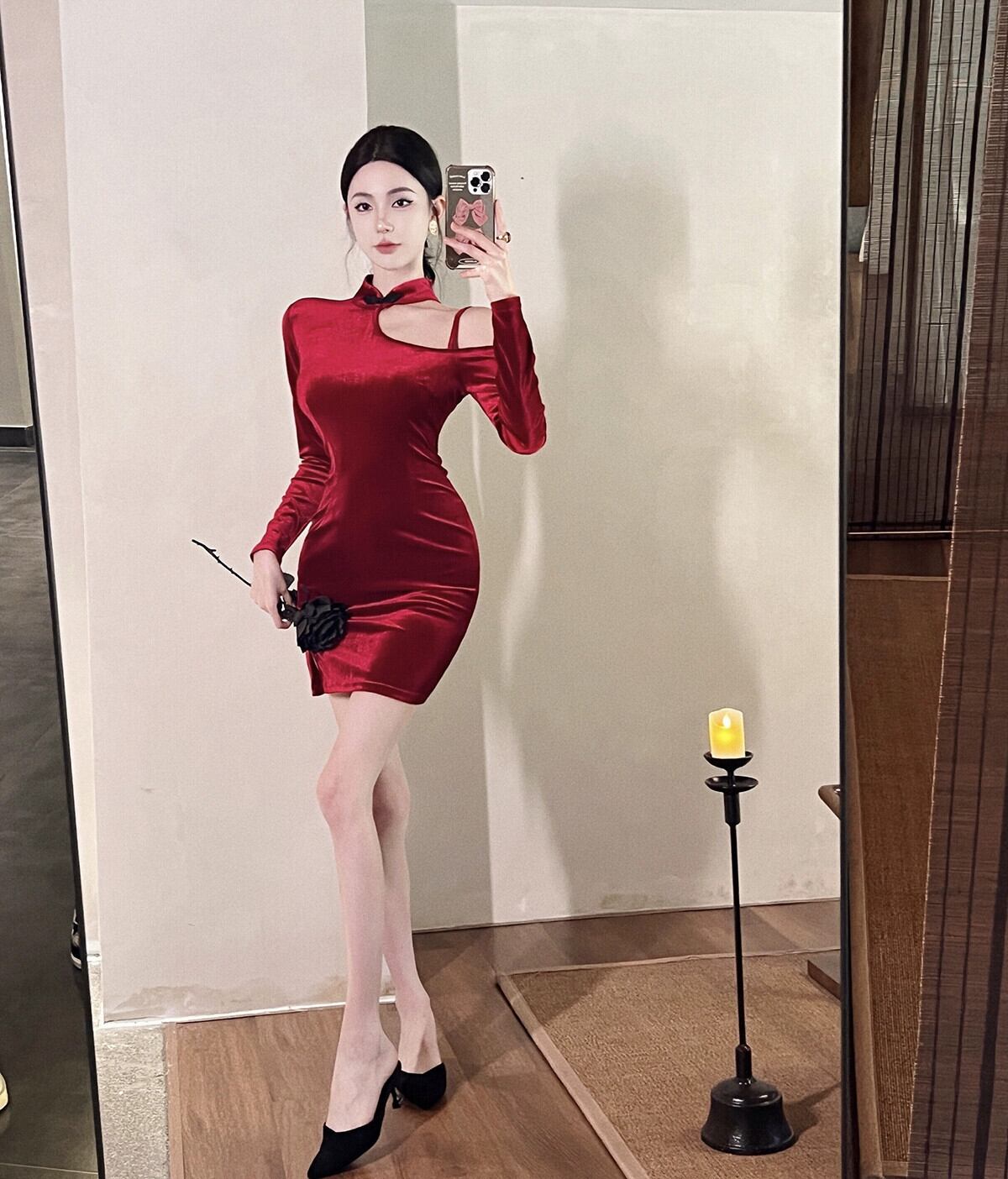ライブ服アンカークリスマスレッドヤングセクシーな斜め襟ストラップレスネックストラップチャイナドレス yeyij75038209321