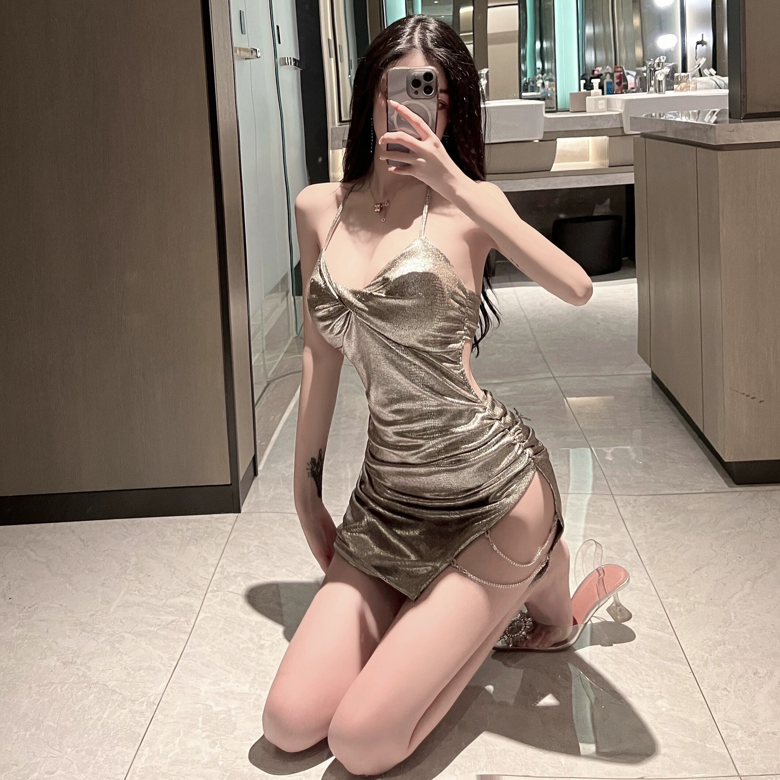 ナイトクラブナイトクラブナイトクラブ女性の夜の作業服光沢のあるセクシーなバックレスチェーンハイスリットサスペンダードレス yeyij66718146138