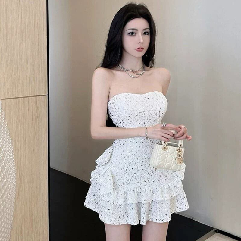 誕生日ドレス白のイブニングドレスハイエンドライト高級ニッチハイエンドスパンコールセクシーなショートチューブトップドレス ホワイト yeyij13577733583