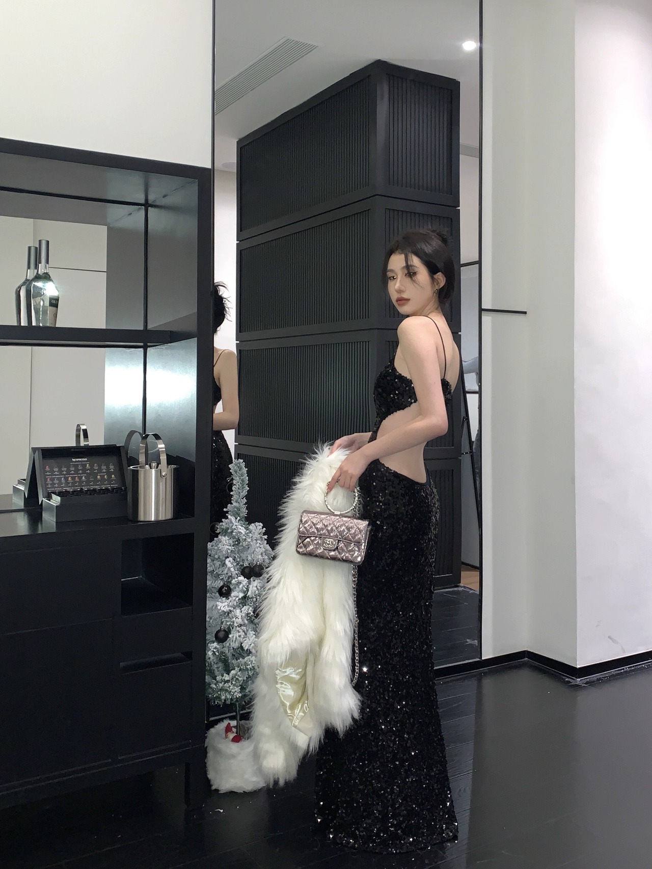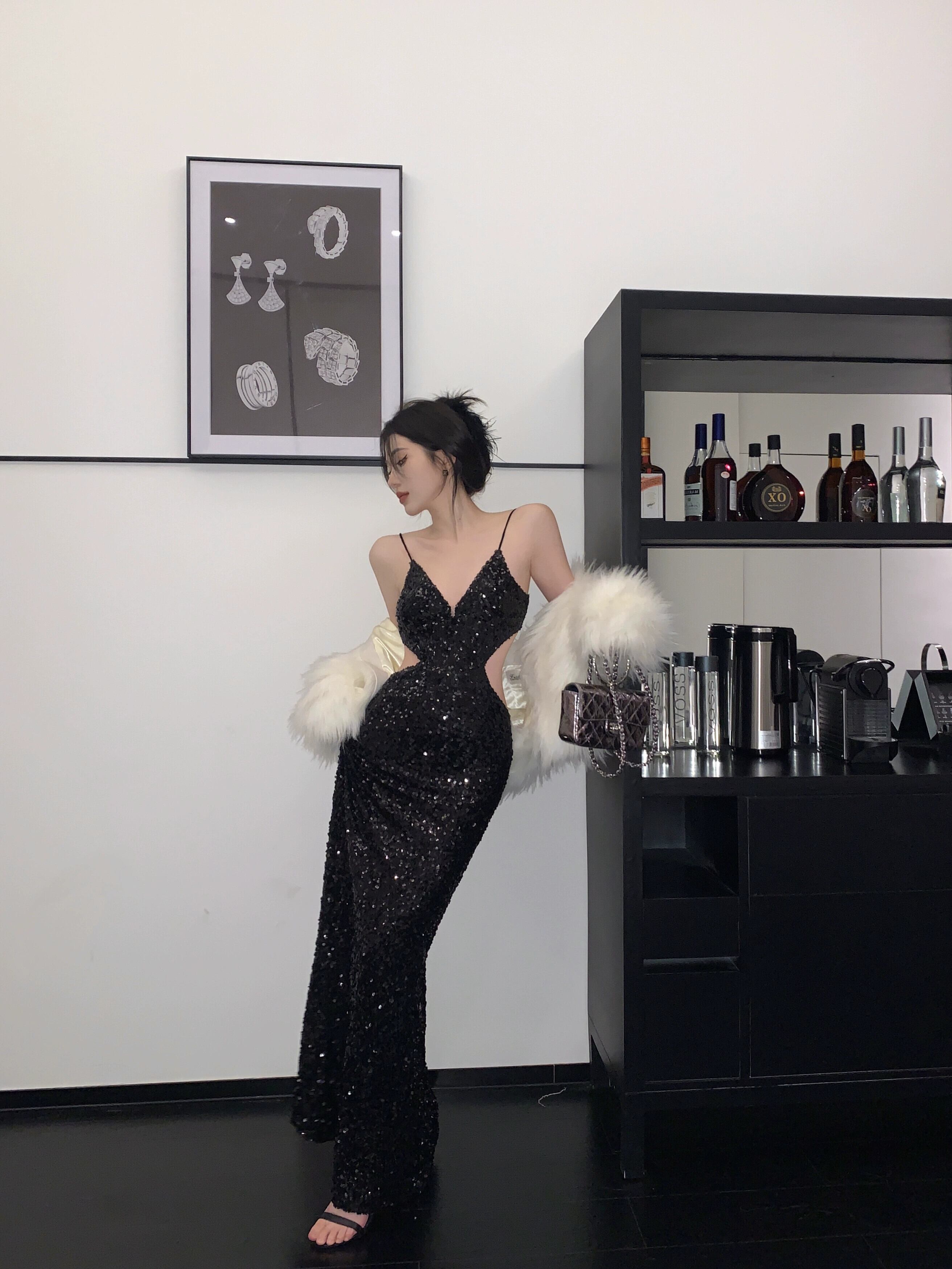 黒のイブニングドレスロングスカート女性のハイエンドライト高級ニッチハイエンドセンス宴会スパンコールセクシーな背中の開いたサスペンダードレス ブラック yeyij9496256632
