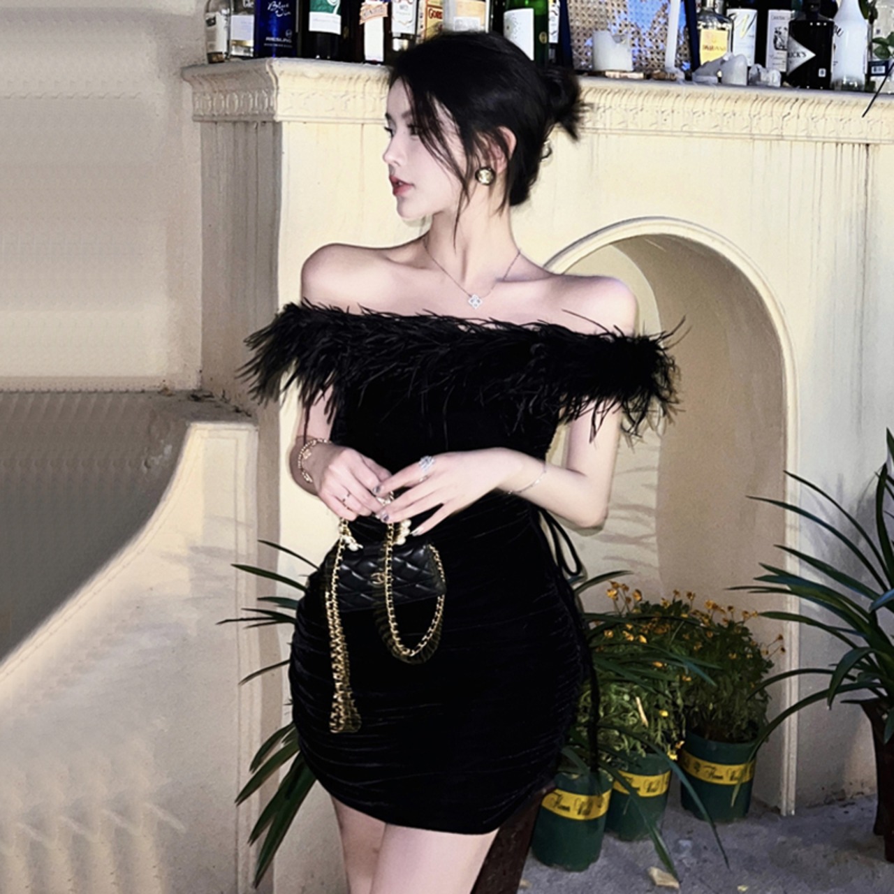 年次総会ブラックドレスハイエンドライト高級ニッチハイエンドセンスダチョウ毛皮ワンショルダーセクシーなオフショルダードレス yeyij43001513558
