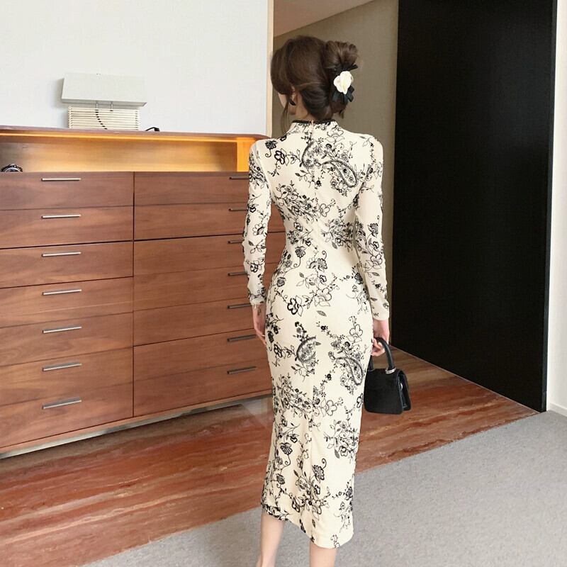 中国風の改良されたチャイナドレス 2022 秋の新作婦人服軽い成熟した気質レトロなミッドレングス長袖ドレス ロング オータム 秋物 yeyij35365771502