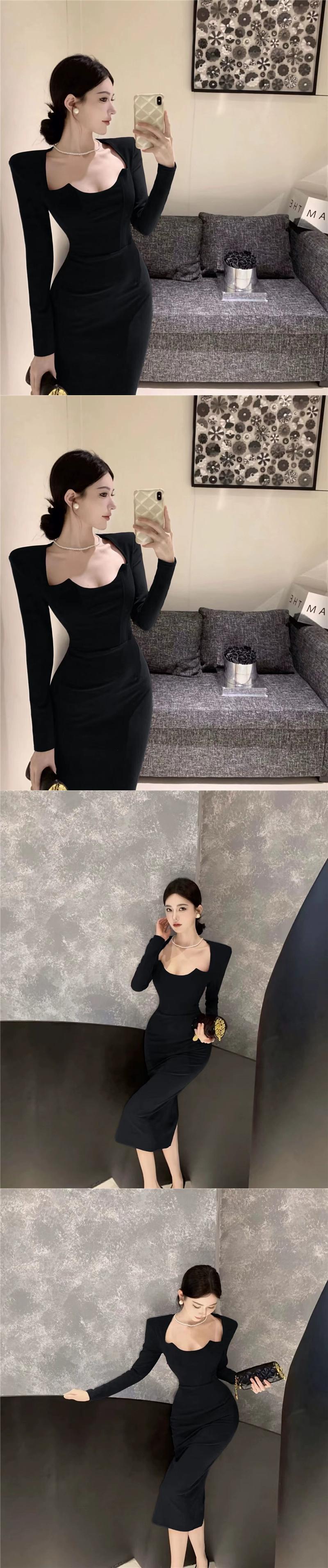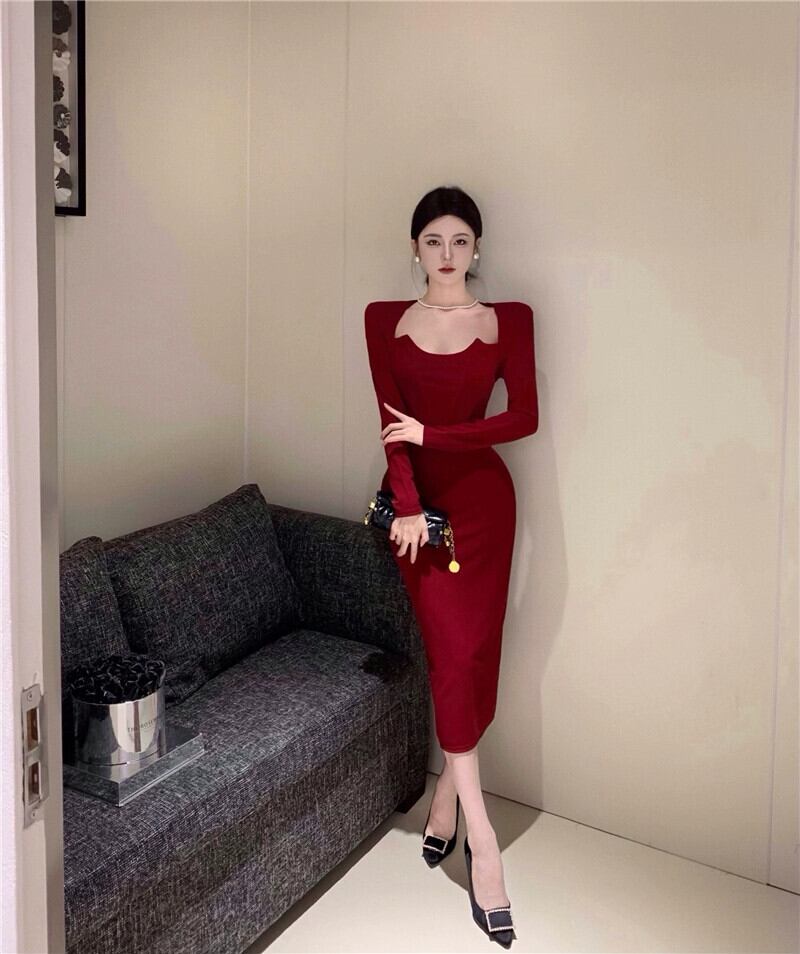 年次総会赤いイブニングドレスハイエンドライトラグジュアリースモールハイレベルトースト服フレンチセクシースクエアカラー長袖ドレス ロング レッド スクウェア yeyij68080568087