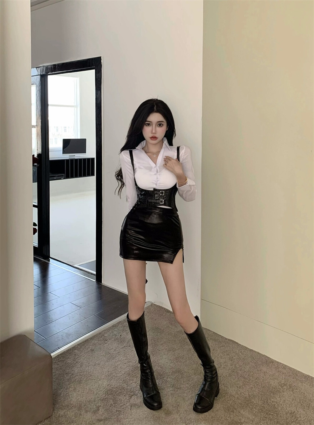 セクシーな純粋な欲望秘書JKセット秋のネクタイタイトシャツ+ウエストカバーレザーヒップスカート オータム 秋物 ピュア yeyij71800707721