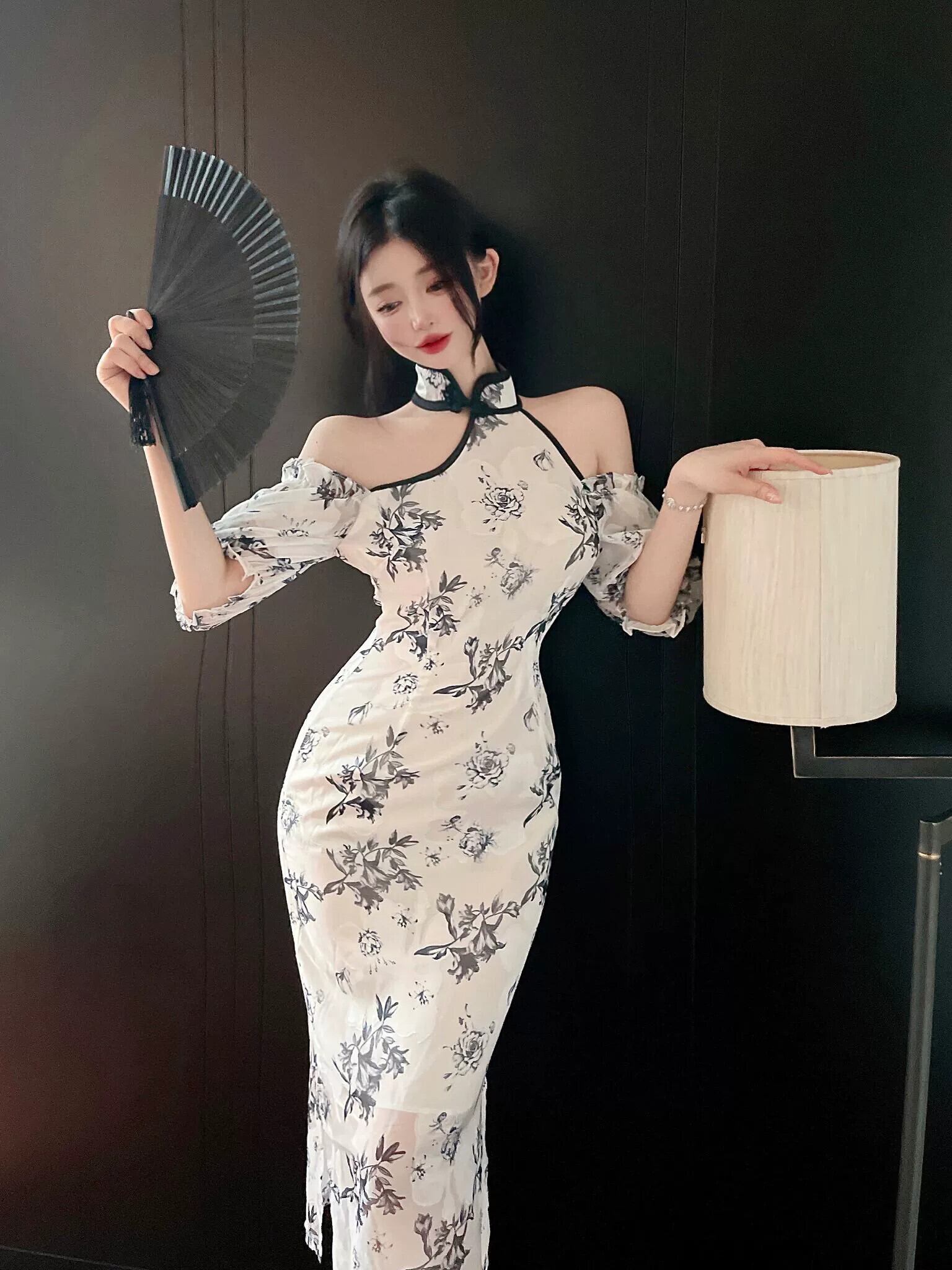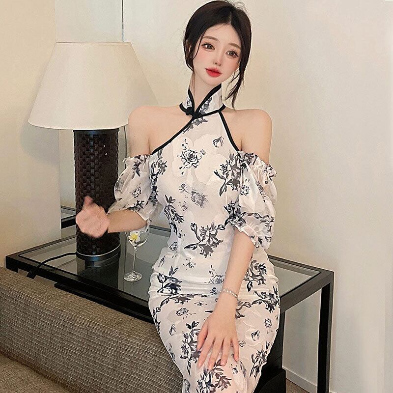 チャイナドレスイブニングドレスハイエンドライトラグジュアリーニッチハイエンドセクシーなオフショルダーホルターネックパフスリーブミッドレングスドレス yeyij65809693776