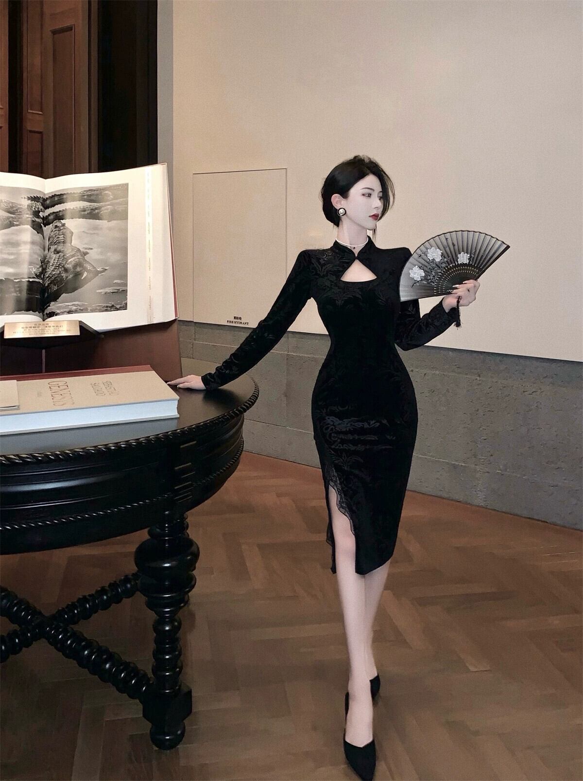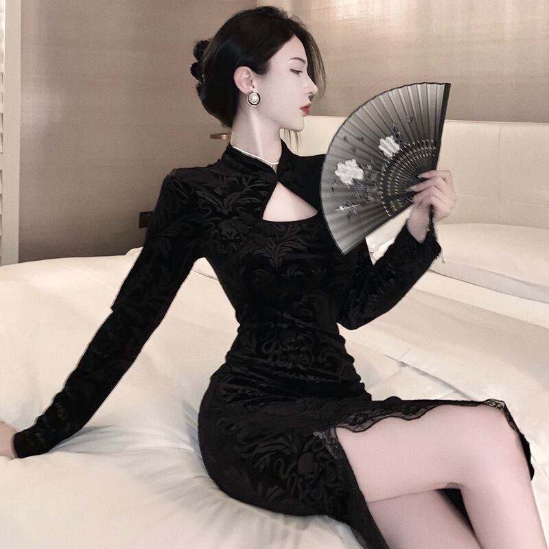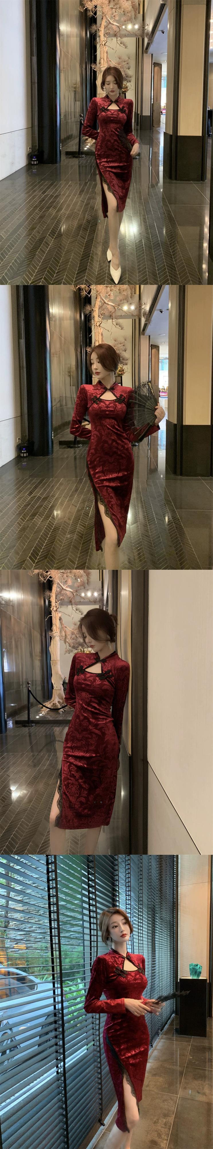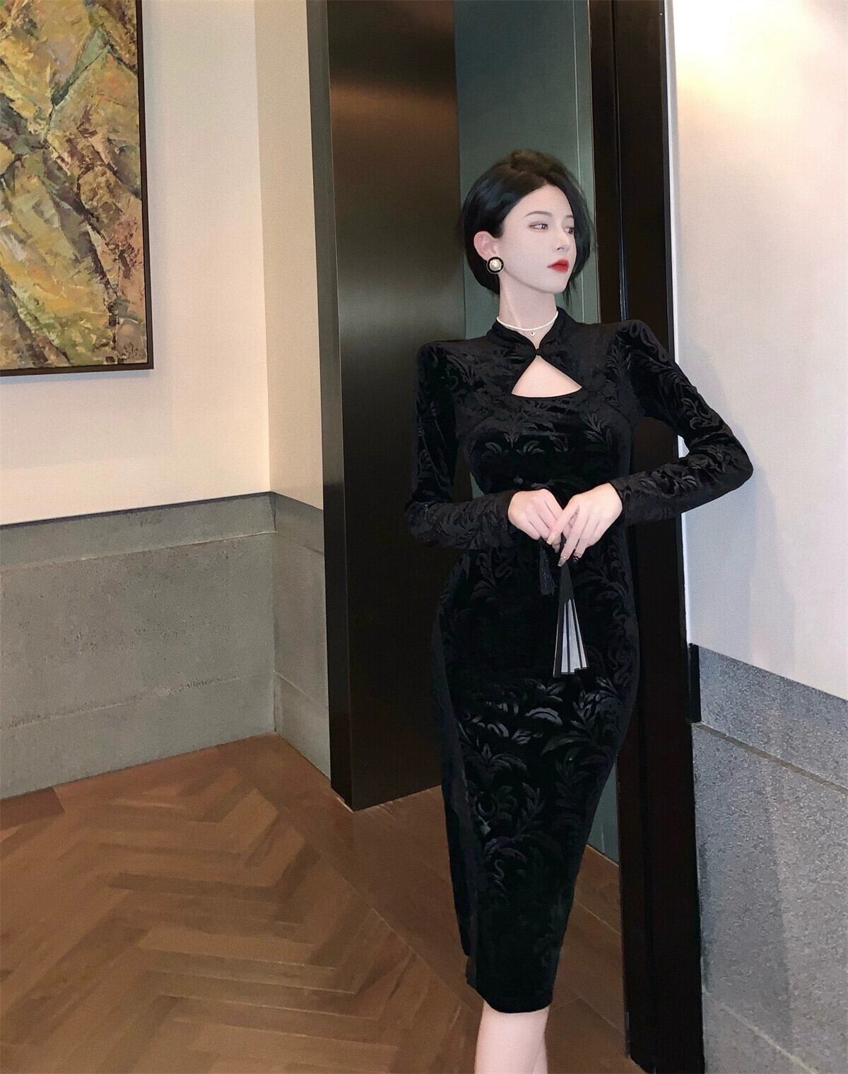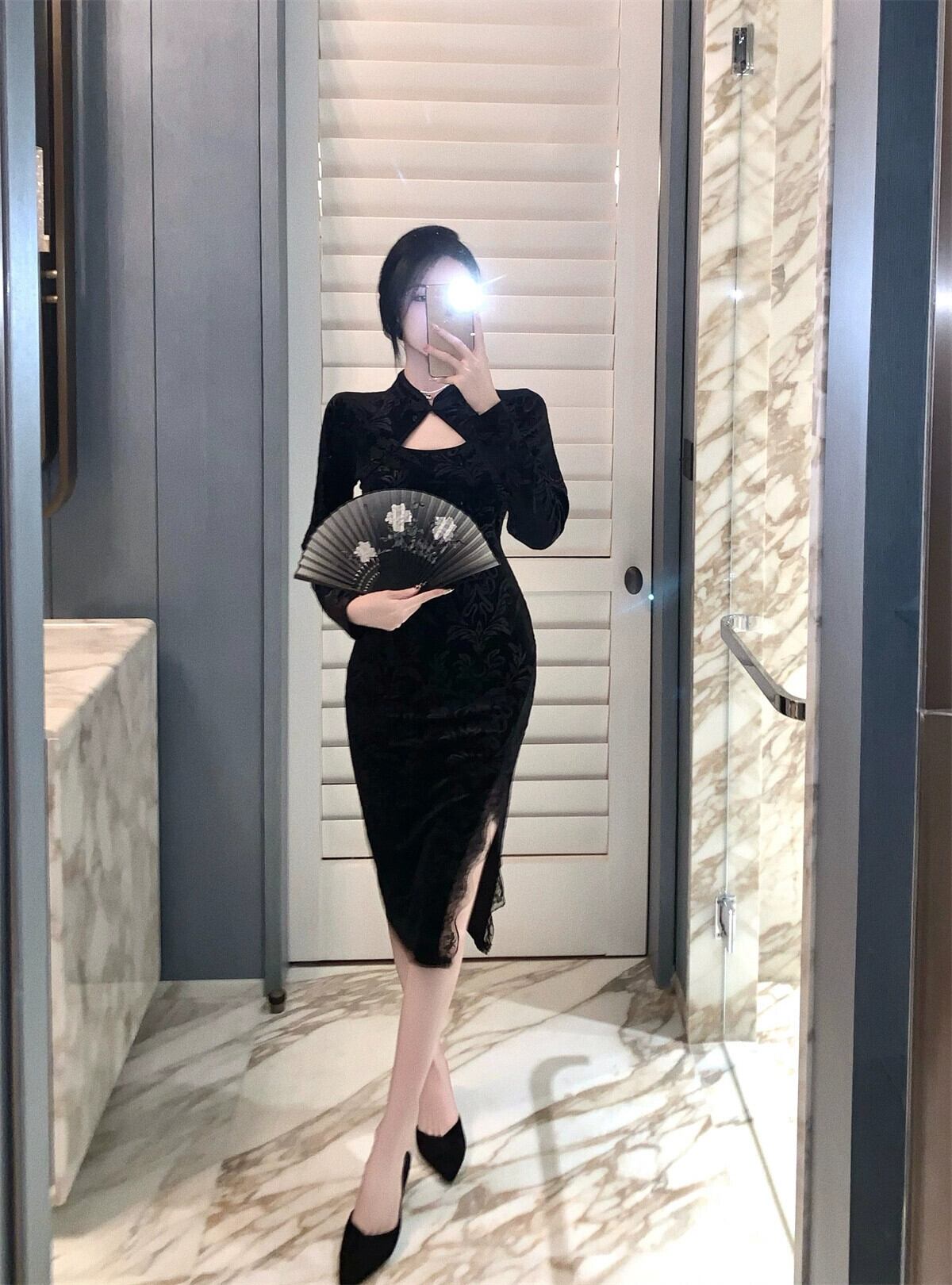 夜の上海チャイナイブニングドレストースト服若い女性の気質ハイエンドゴールドベルベットミッドレングスドレス yeyij70185615238