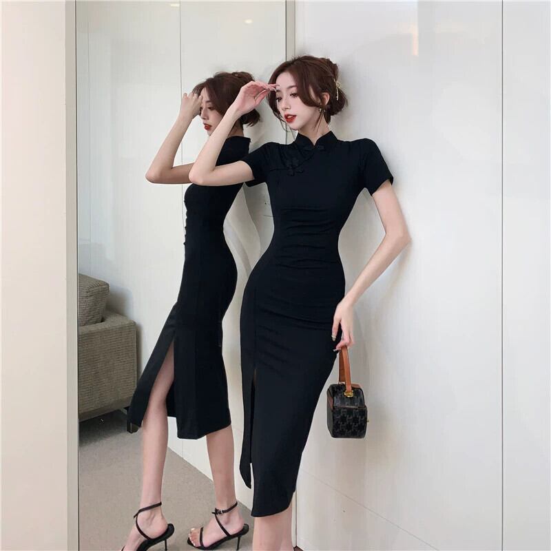 中国風のチャイナドレス新2023中華民国の若いスタイルの気質黒改良版スリムミドルドレス ブラック yeyij92646846762