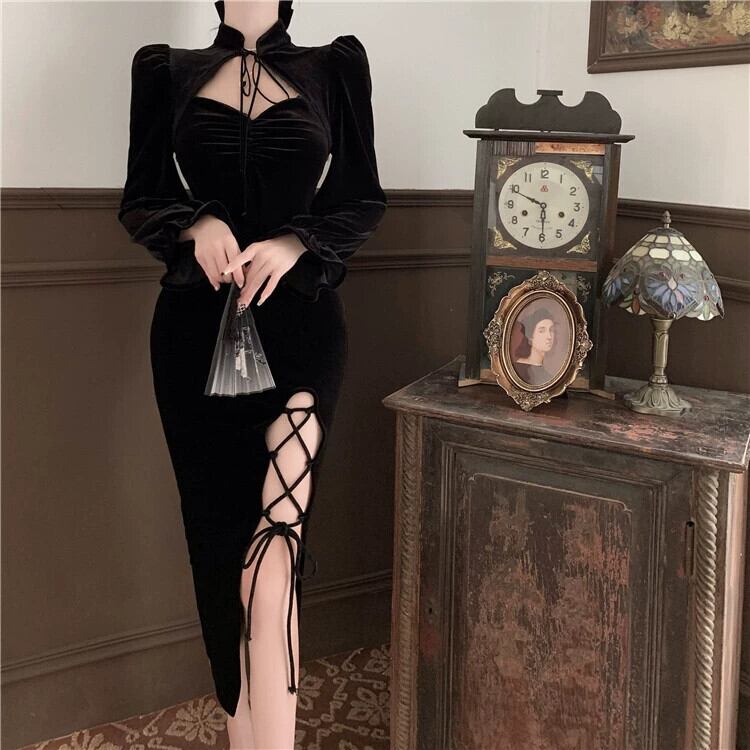 黒チャイナイブニングドレスハイエンドライト高級ニッチ小さなドレス秋と冬のパーティー気質長袖ゴールドベルベットドレス ロング ブラック オータム 秋物 ウィンター 冬物 yeyij58964039472