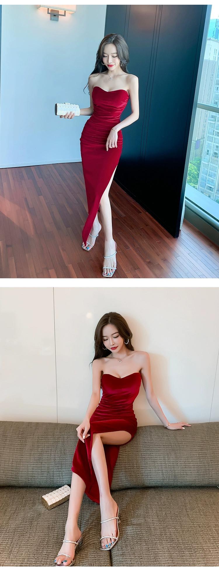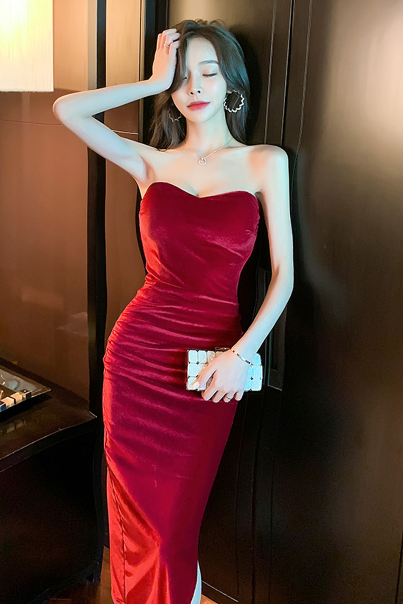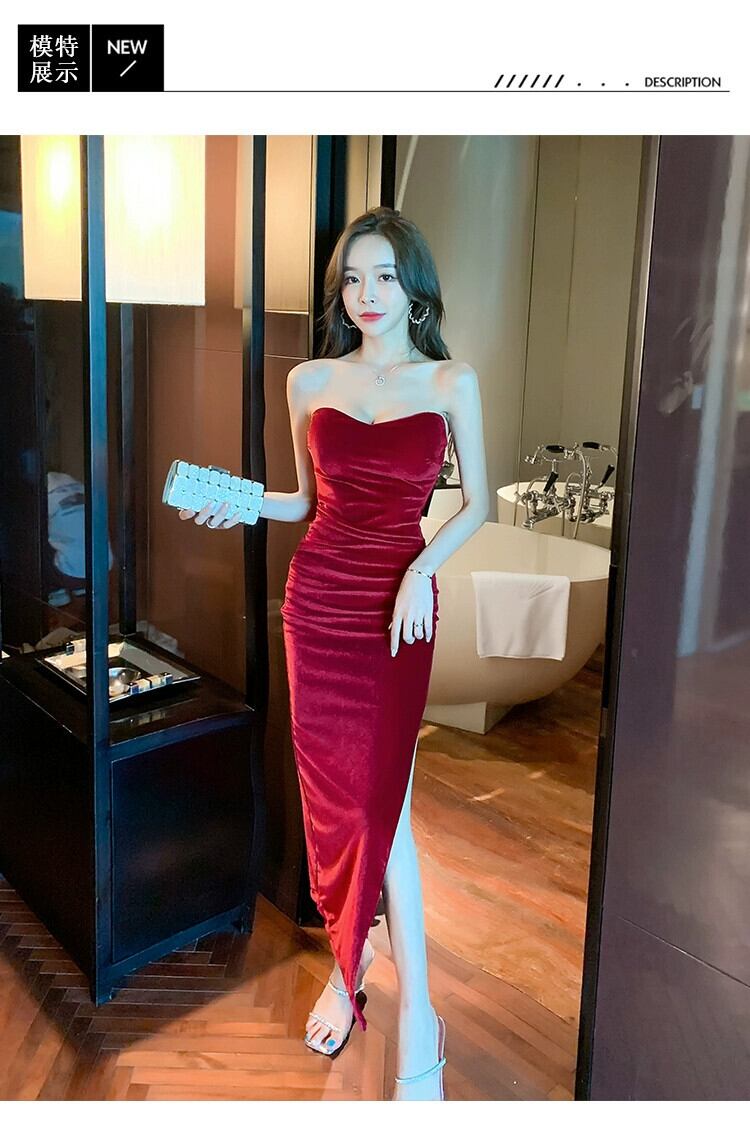 ナイトクラブの女性のイブニングドレスロングスカートパーティー気質セクシーなローカットディープ V ネックゴールドベルベットチューブトップドレス Vネック yeyij63889827850