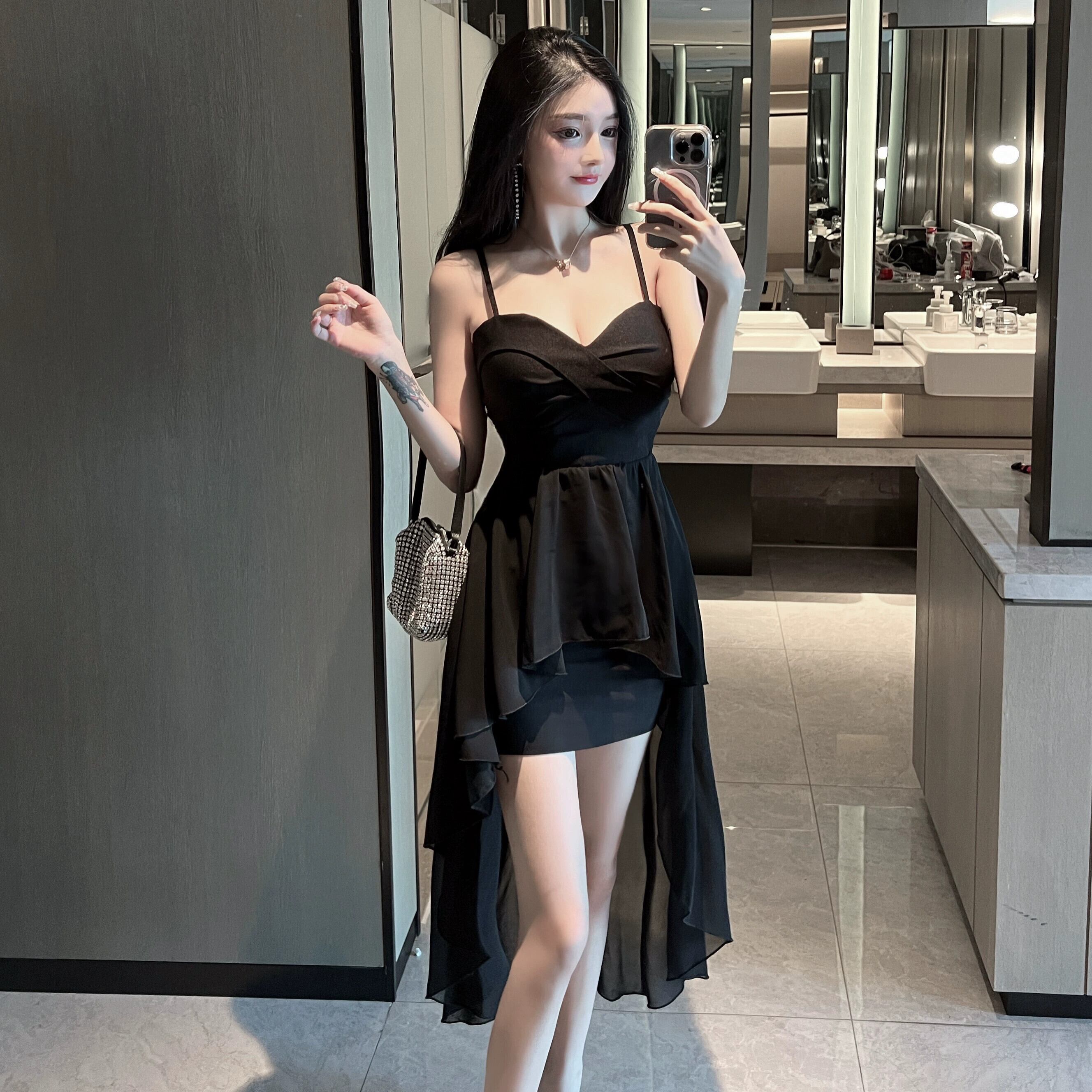 ナイトクラブの女性の夜の作業服技術者作業服イブニングドレスセクシーなフロントショートバックロングサスペンダードレス yeyij9347390782