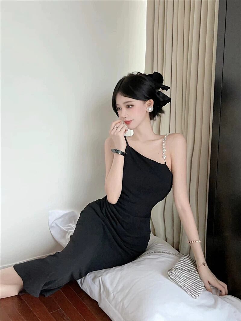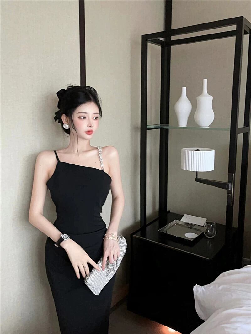 黒のイブニングドレスロングスカート女性のハイエンドライト高級ニッチハイエンド自己修養の感覚セクシーな斜め襟パールサスペンダードレス ブラック 真珠 yeyij67637963372