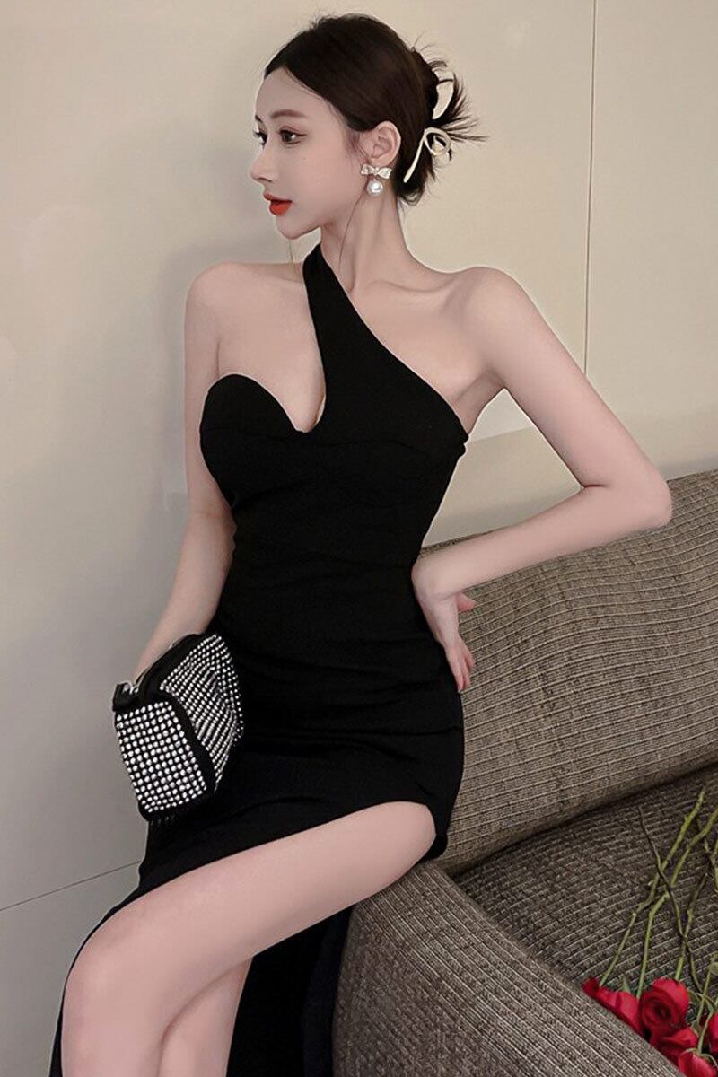 黒のイブニングドレスロングスカートナイトマーケットの女性のライト高級気質ハイエンドセクシーなローカットスリットハンギングネックチューブトップドレス ブラック yeyij36403610901