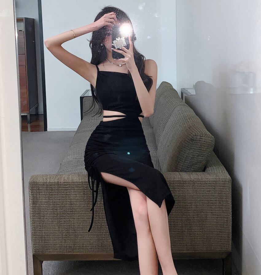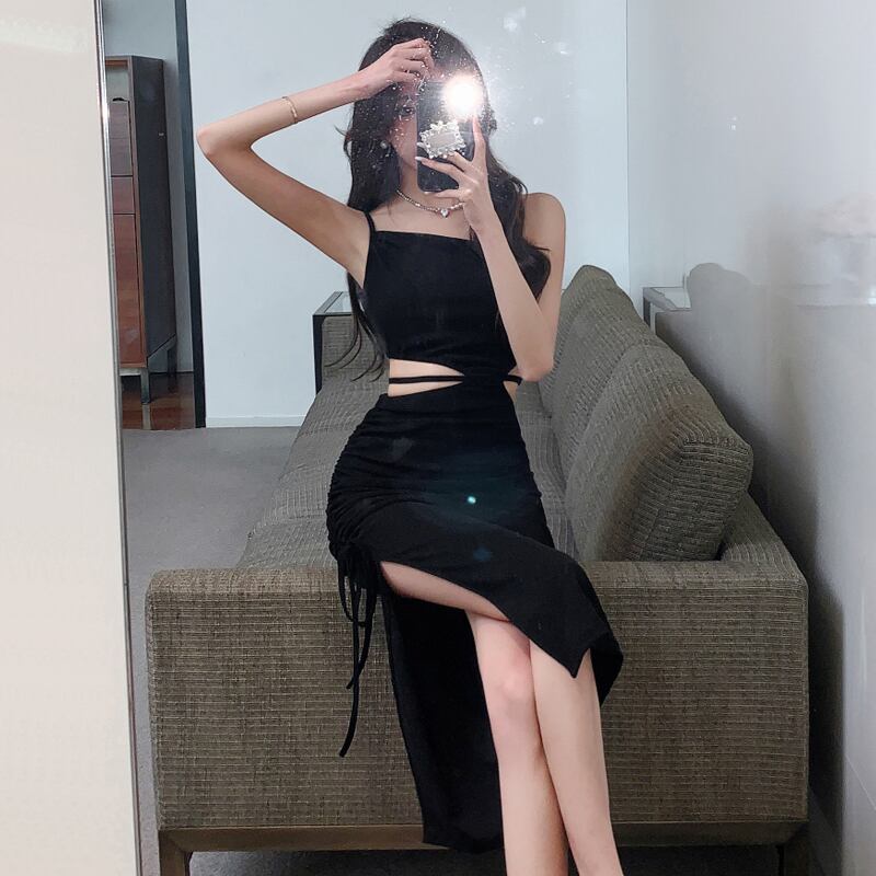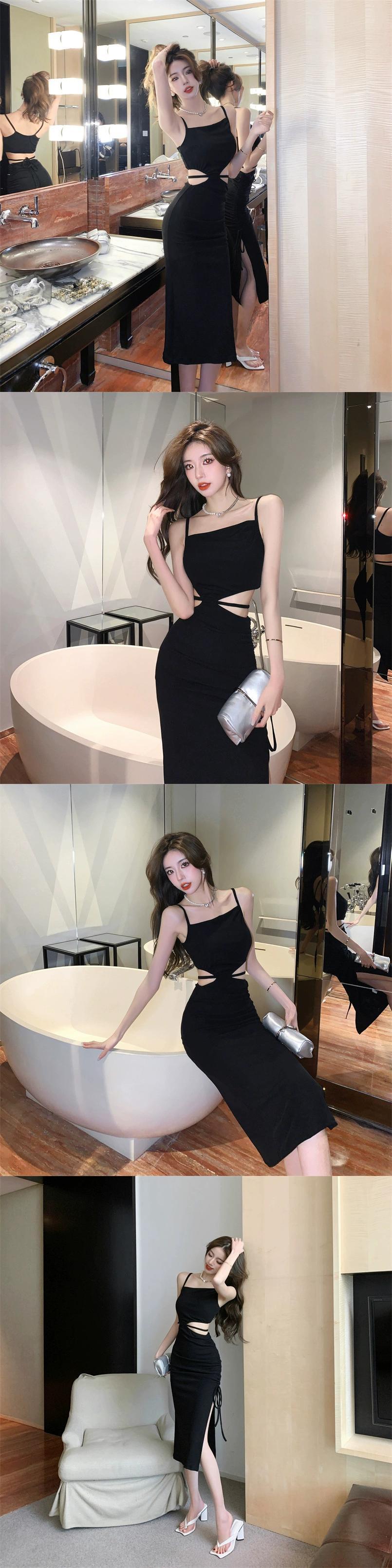 黒のイブニングドレスの女性の夏の海辺の休暇気質スリムセクシーな中空アウトウエストミッドレングスサスペンダードレス ブラック サマー 夏物 yeyij52808724363