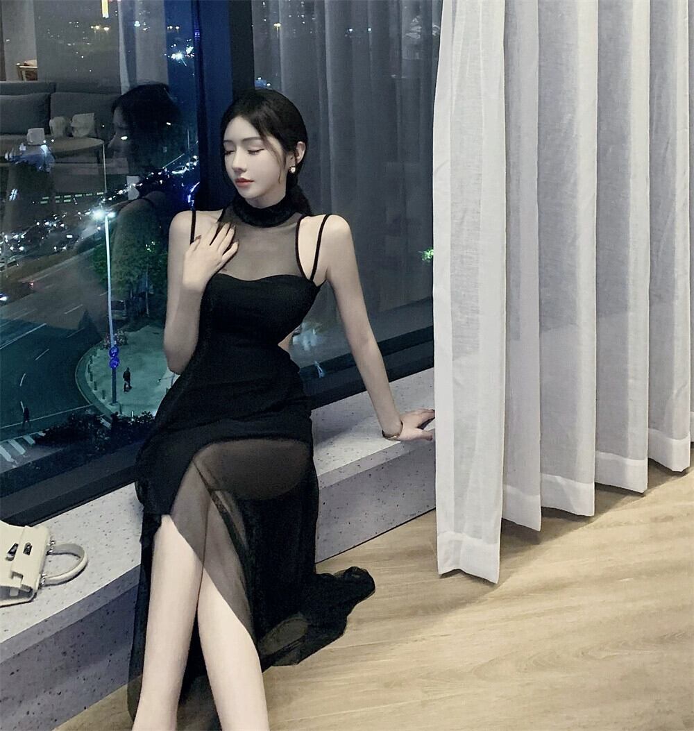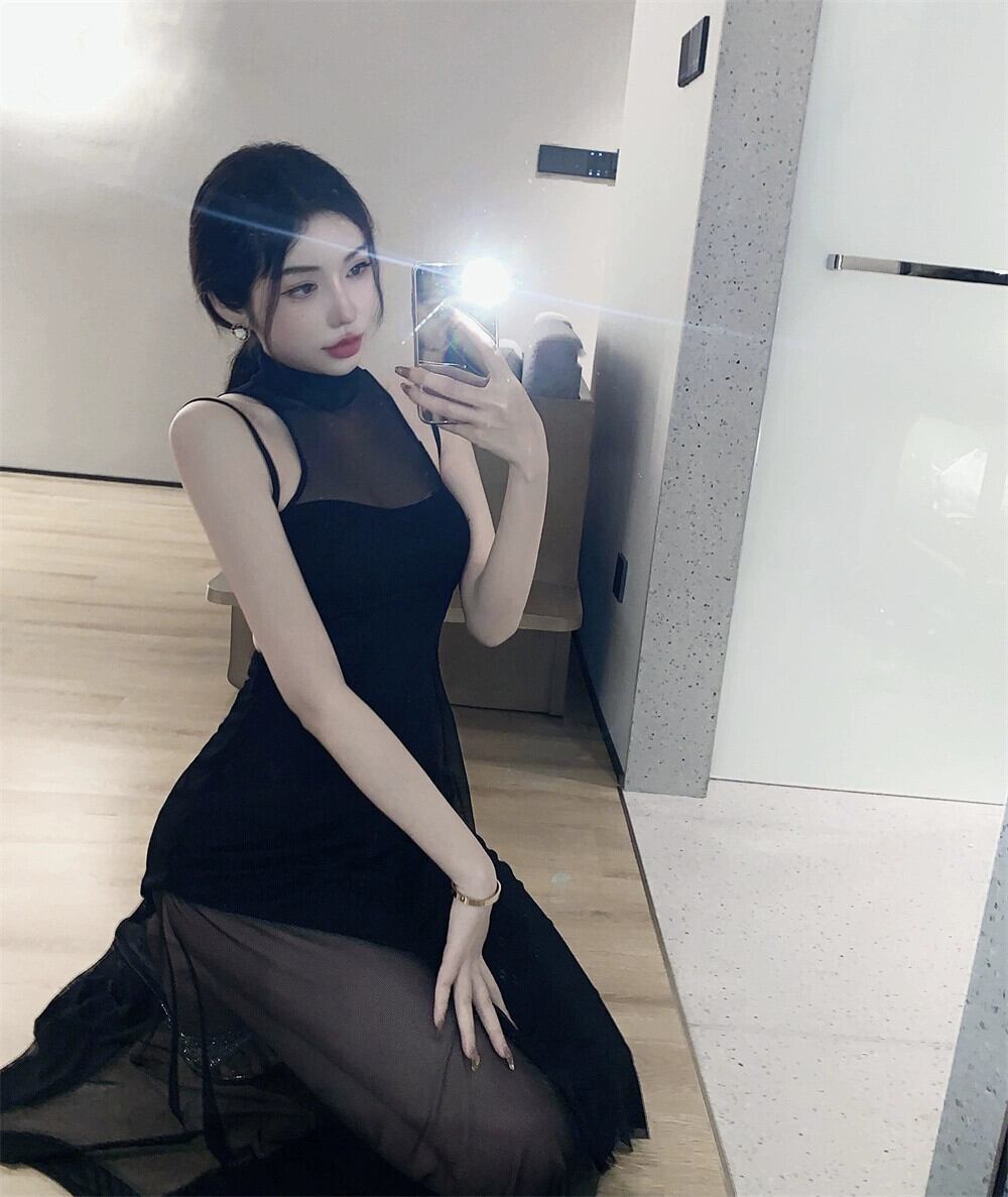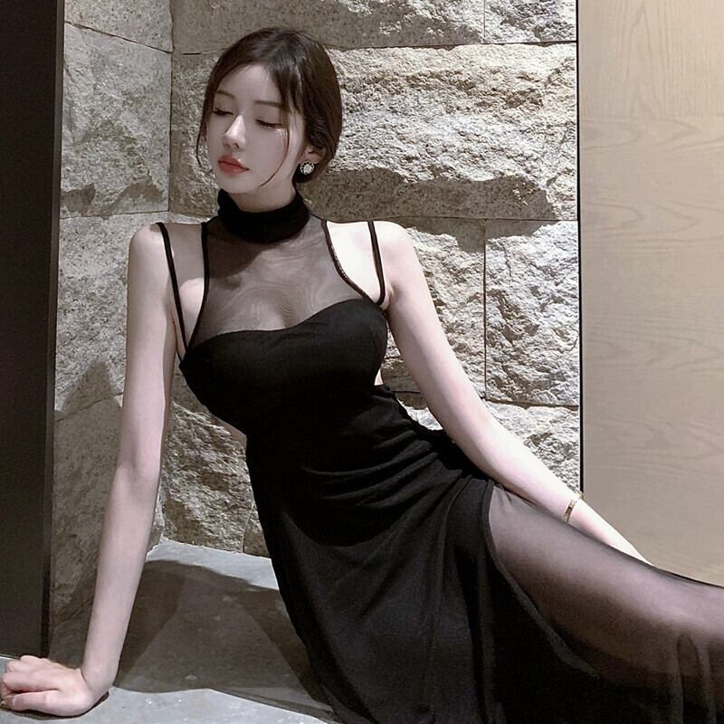 黒のイブニングドレスロングスカートの女性のハイエンドセンスライト高級ハイエンド気質セクシーなメッシュステッチホルターネックストラップドレス ブラック yeyij45291784919