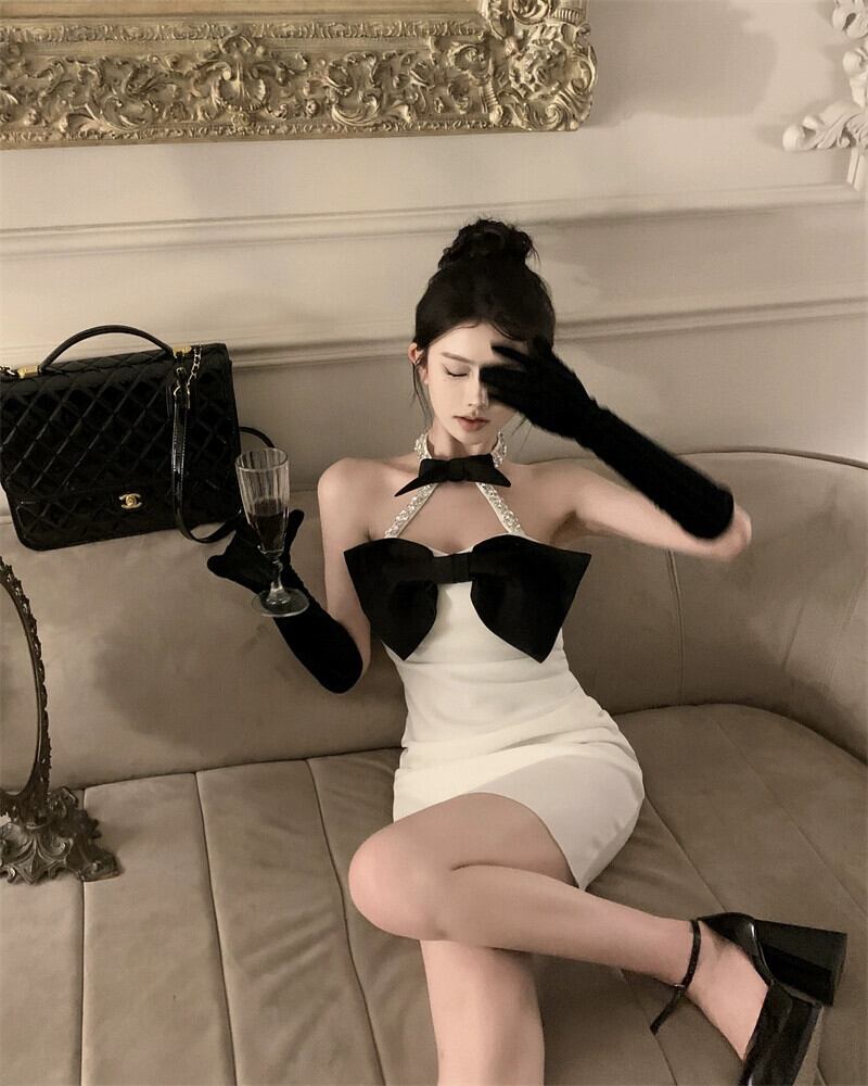 誕生日ドレス女性のハイエンドセンスパーティーフレンチスイートリボンセクシーなショートサスペンダーホルターネックドレス 大人ガーリー スウィート キュート カジュアル yeyij53288828267