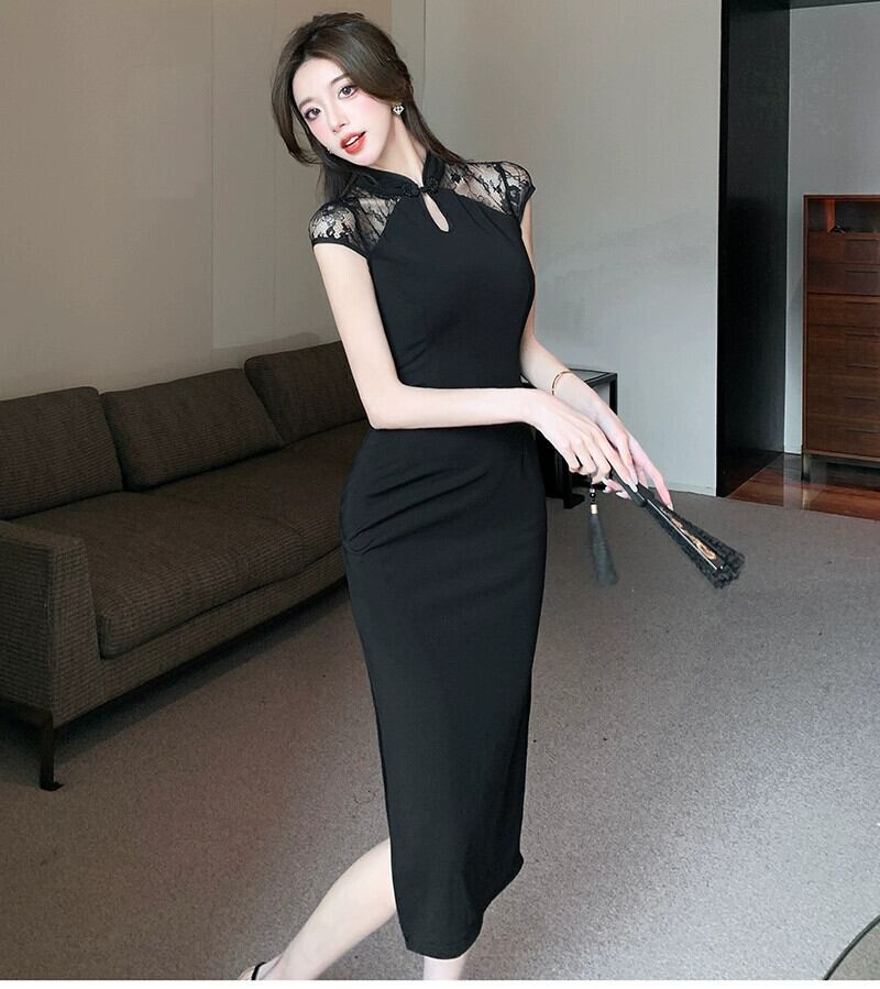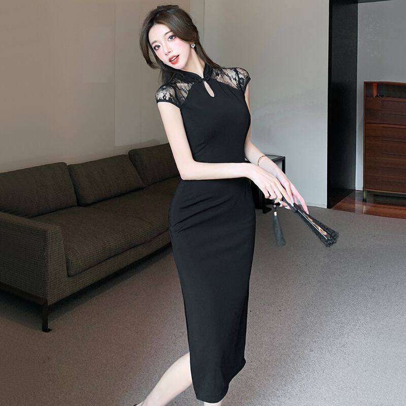 黒チャイナイブニングドレス女性の高度な国民スタイルの若いセクシーなオープンバックレースステッチミッドレングスドレス ブラック yeyij44736204947