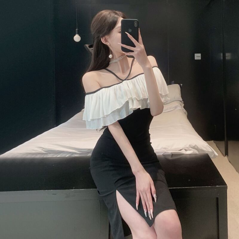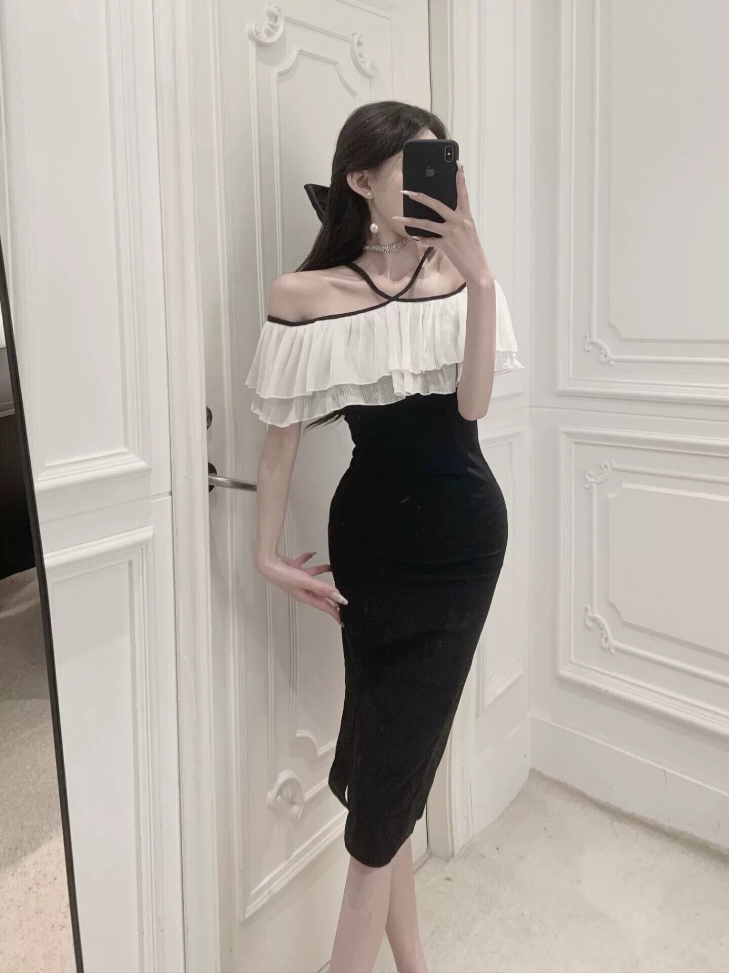 ヘップバーンスタイルイブニングドレスレディースフレンチハイエンドセンスパーティー旅行休暇セクシーな一言襟ストラップレスホルターネックドレス yeyij36292434100