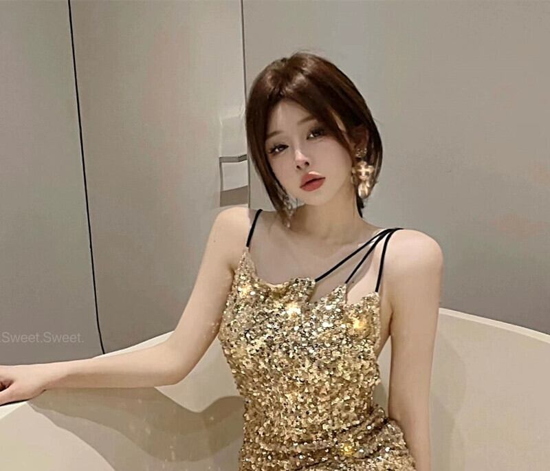ゴールドスパンコールイブニングドレス女性 2023 新しいハイエンド宴会セクシーなバックレスショートバッグヒップサスペンダードレス yeyij3980577274