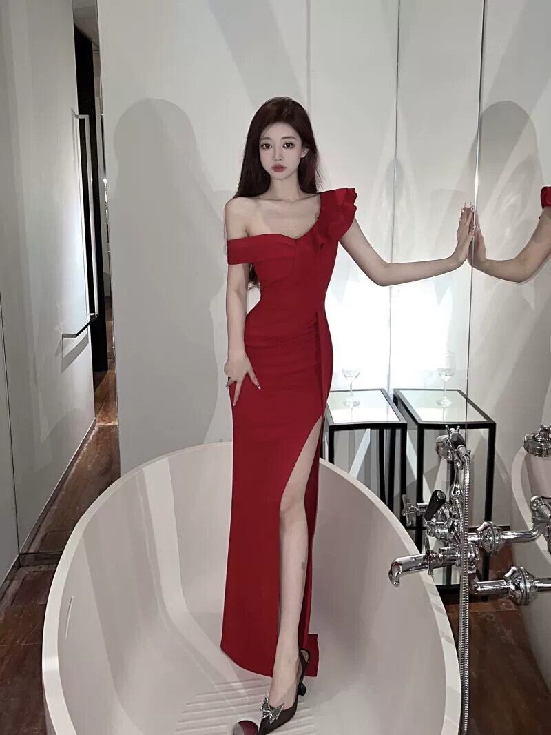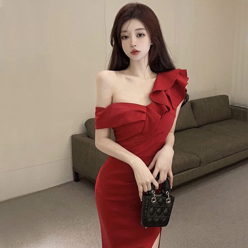 イブニングドレスロングスカートレディース高級感宴会気質フレンチフリルスリットセクシーな斜め襟オフショルダードレス ラッフル yeyij85711351644
