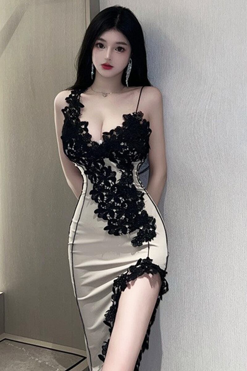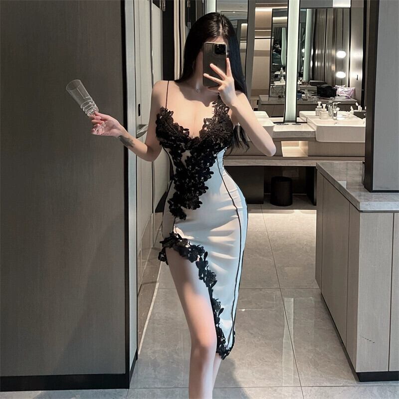 ナイトクラブの女性の夜の宴会気質イブニングドレスレースステッチセクシーなスリットミッドレングスサスペンダードレス yeyij75433656963