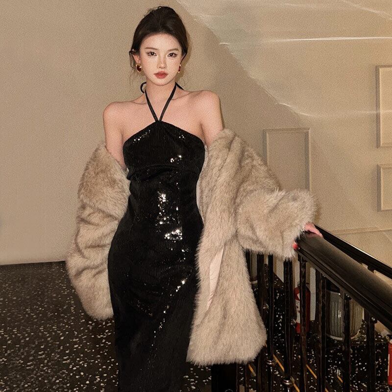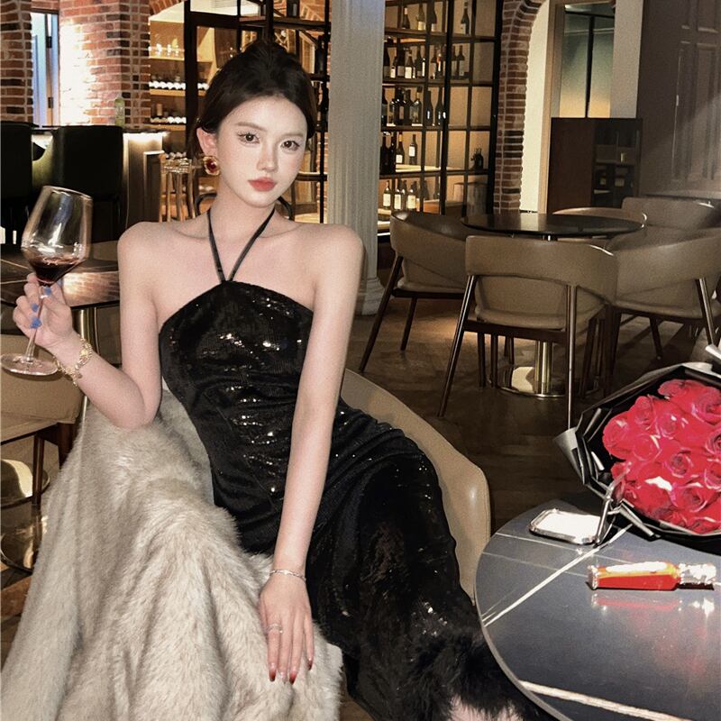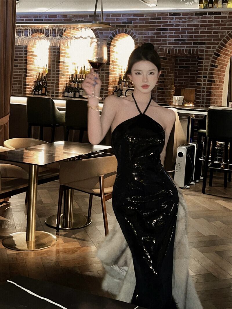 黒のイブニングドレスロングスカート女性のライト高級ニッチハイエンドハイエンドスパンコールセクシーな背中の開いたストラップホルターネックドレス ブラック yeyij18197825922