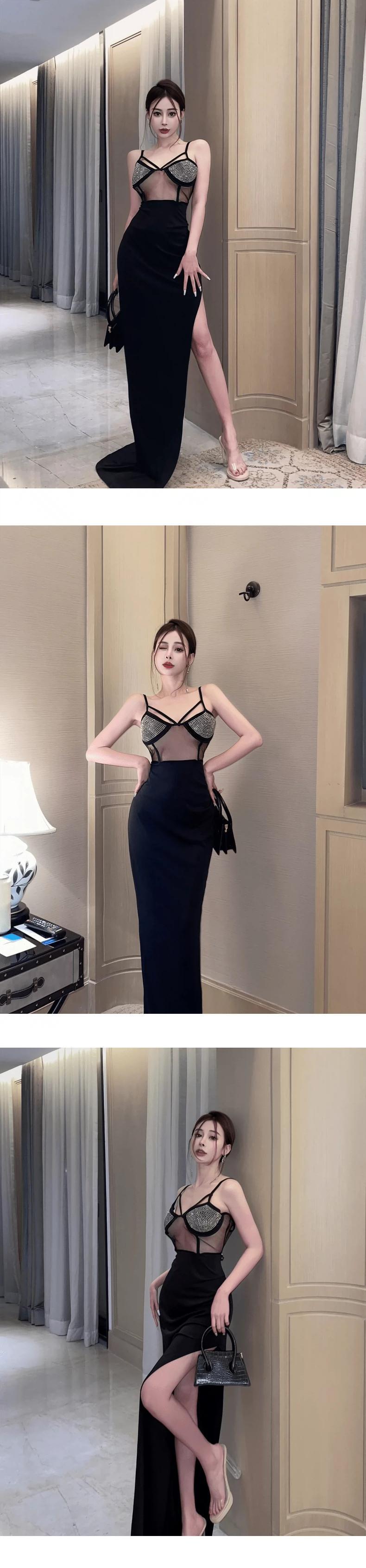 イブニングドレスロングスカートナイトマーケット女性のナイトクラブ光沢のあるダイヤモンド宴会気質セクシーなメッシュステッチサスペンダードレス yeyij74798703207