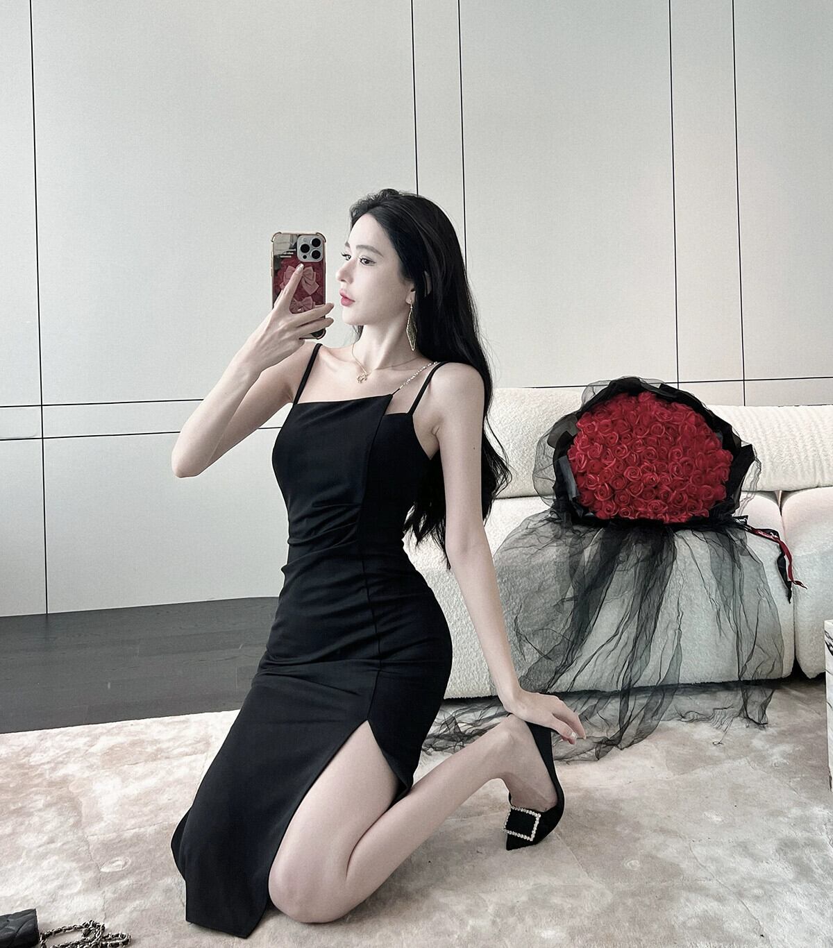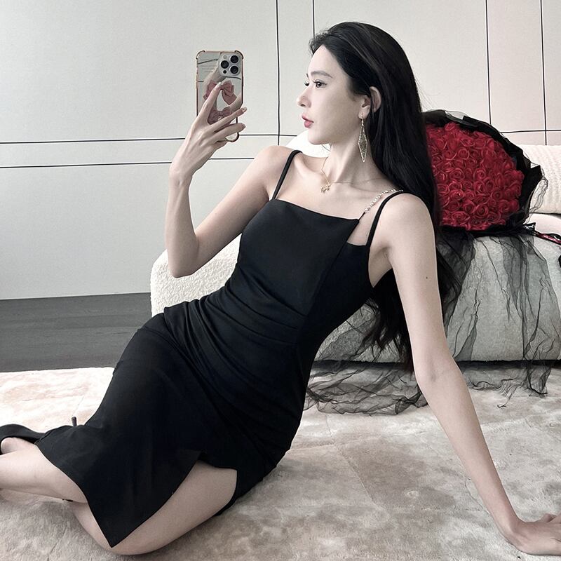 -エンドリトルブラックドレス女性の夏ヘップバーンスタイルの気質女神ファンブラックセクシーなミッドレングスのサスペンダードレス サマー 夏物 yeyij53930979839