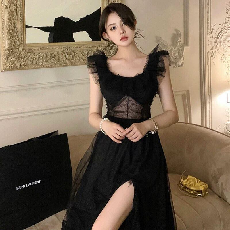黒のイブニングドレスロングスカート女性のハイエンドセンスパーティーホリデーフレンチスーパーフェアリーレースメッシュガーゼサスペンダードレス ブラック yeyij65009075697