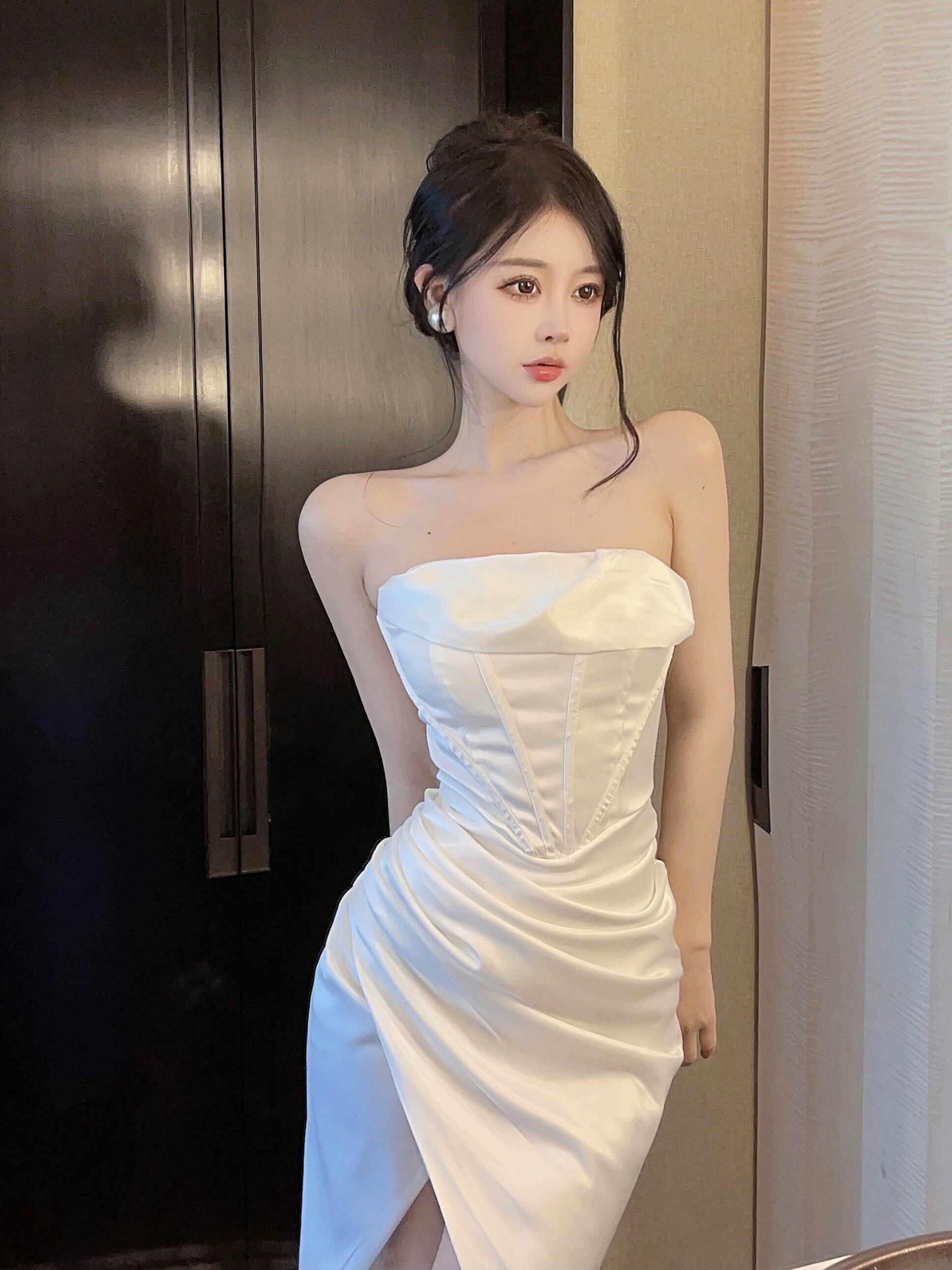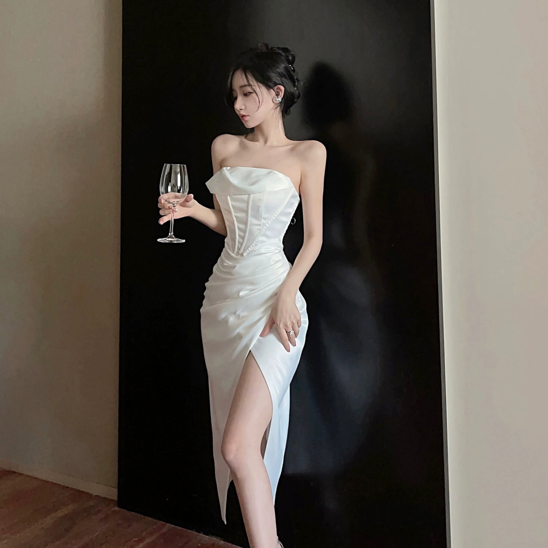ホワイトイブニングドレスロングスカート女性のハイエンドセンスライト高級ハイエンド誕生日ウエストウエスト細い魚の骨セクシーなチューブトップドレス yeyij81966103686