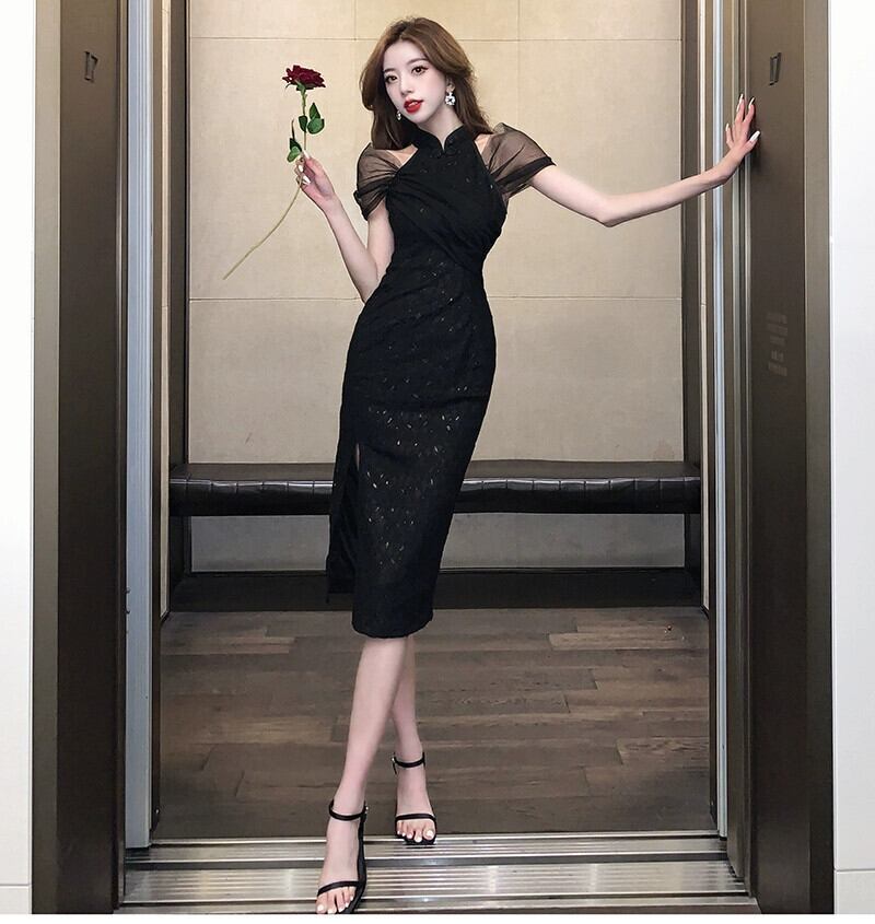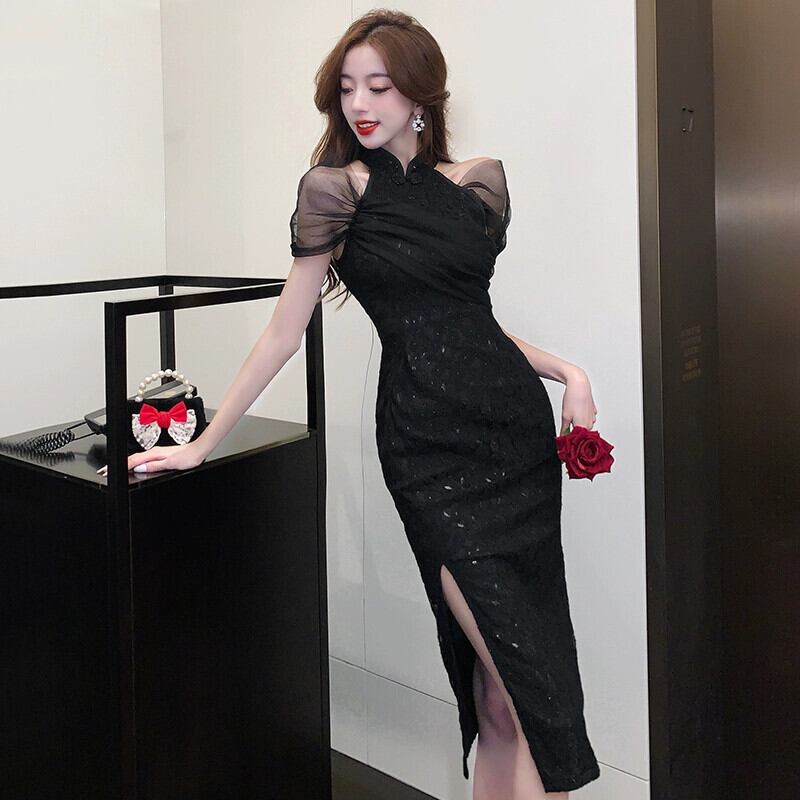 チャイナ イブニング ドレス - エンド ライト ラグジュアリー ニッチ アドバンス センス 改善された中国風のセクシーなストラップレス ブラック スパンコール ドレス yeyij56849092208