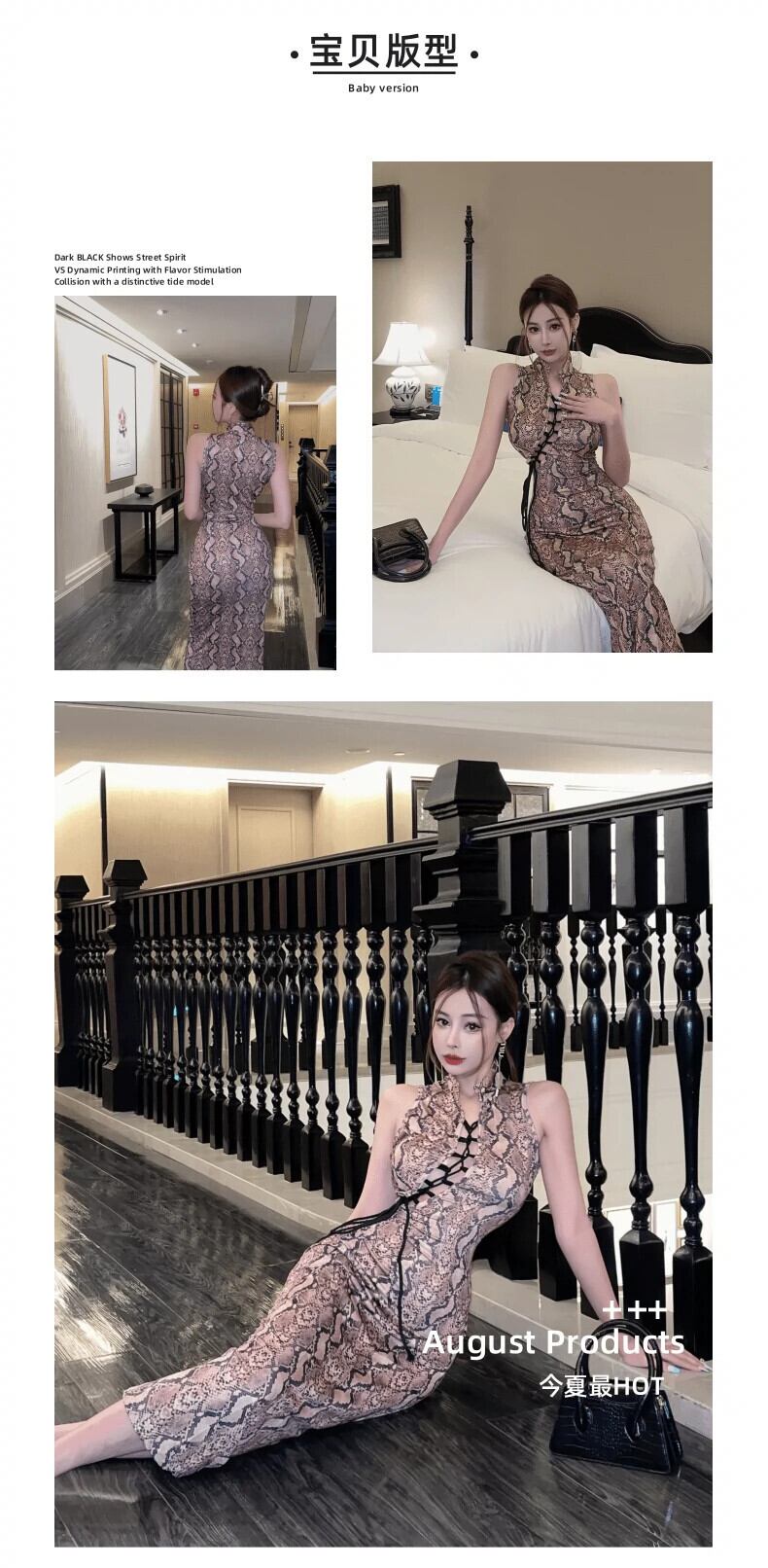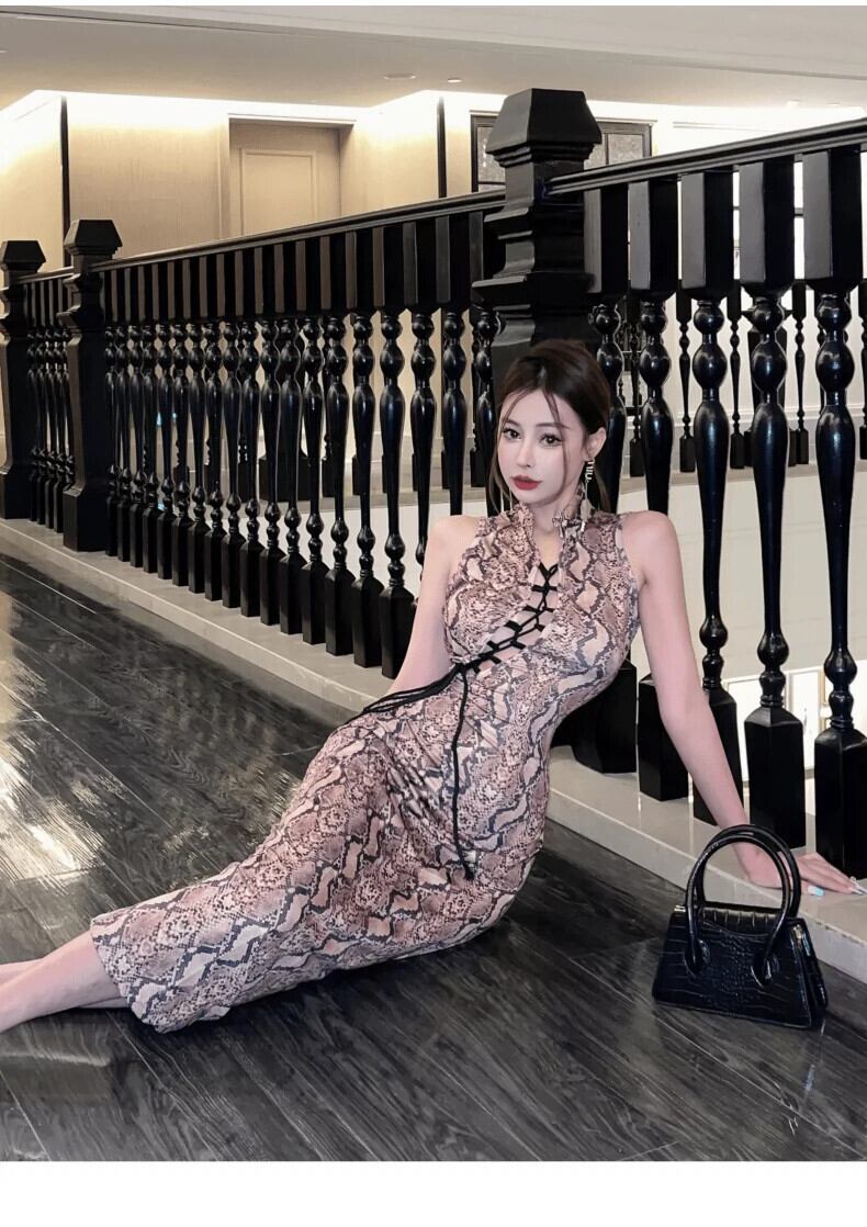 ナイトクラブ女性の夜の作業服オーバーオールセクシーなクロス包帯レトロヘビ柄ノースリーブロングドレス yeyij95654497056