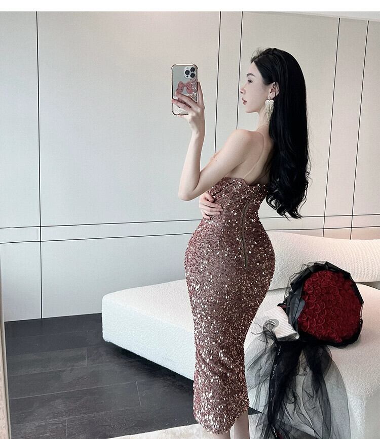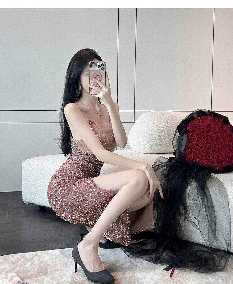 スパンコールイブニングドレスの女性のハイエンドセンスライト高級ハイエンドメッシュスプライシングスリットロングスカートセクシーなVネックサスペンダードレス yeyij29242416730