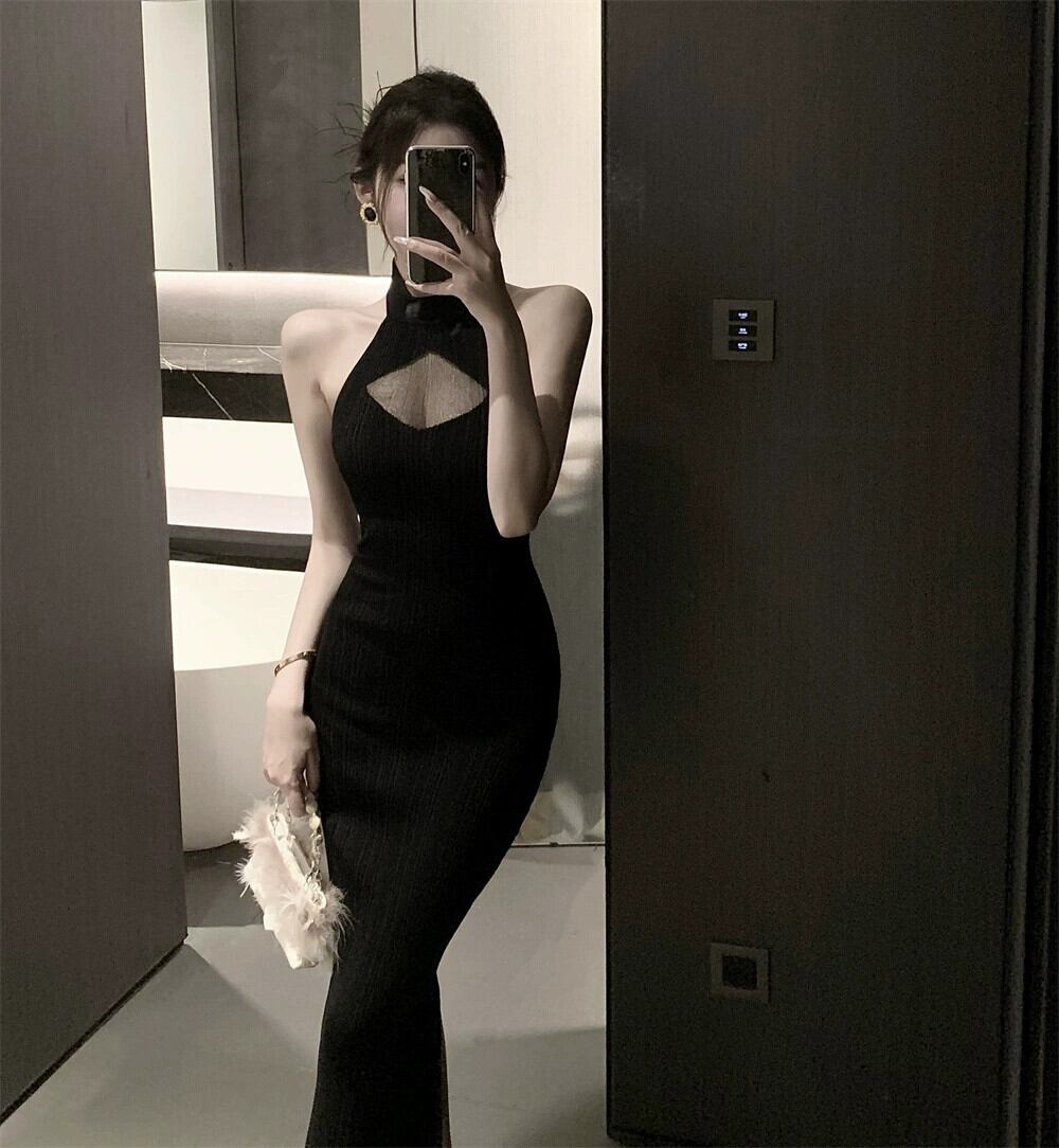 黒のイブニングドレスロングスカート女性のハイエンドセンスセレブ気質セクシーな中空メッシュステッチホルターネックドレス ブラック yeyij9225016693