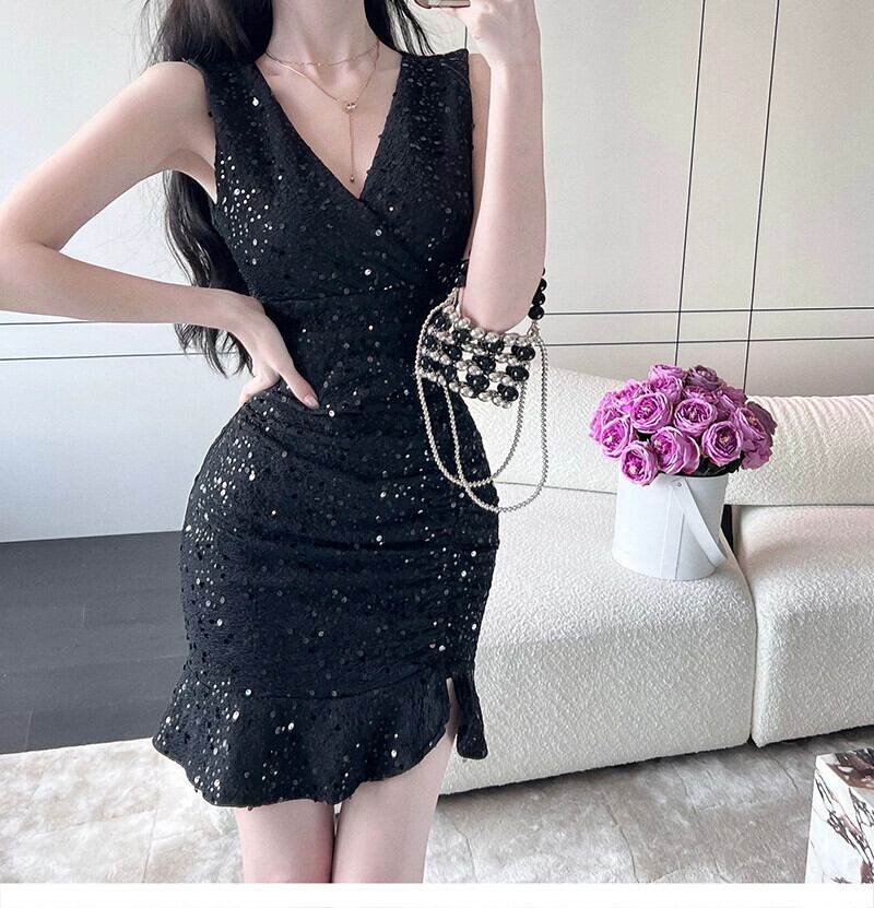 黒スパンコールドレススカート女性のハイエンドセンスセレブパーティー宴会気質セクシーなノースリーブヒップドレス ブラック yeyij72542287423