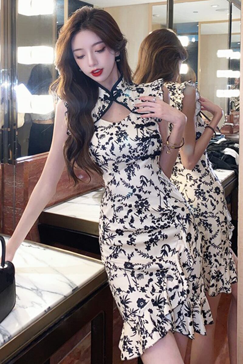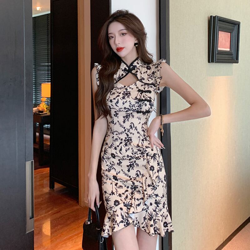 ライブ服女性ダンスアンカー服若いセクシーな花柄小さなフライングスリーブマーメイド改良されたチャイナドレス yeyij32024272342