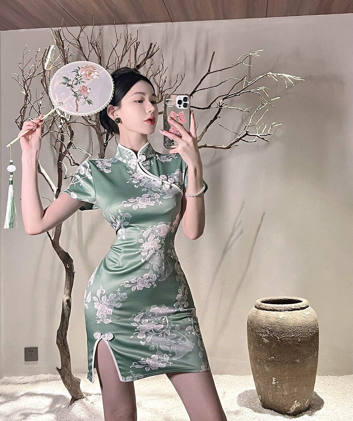 グリーンチャイナドレスライブ服女性アンカーpogenicハイエンド若いレトロセクシーな改良ドレス yeyij10455905085