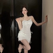 白いスパンコールの誕生日ドレス女性のハイエンドセンスパーティーフレンチスイートスーパーフェアリーセクシーなショートサスペンダードレス ホワイト 大人ガーリー スウィート キュート カジュアル yeyij43007686507