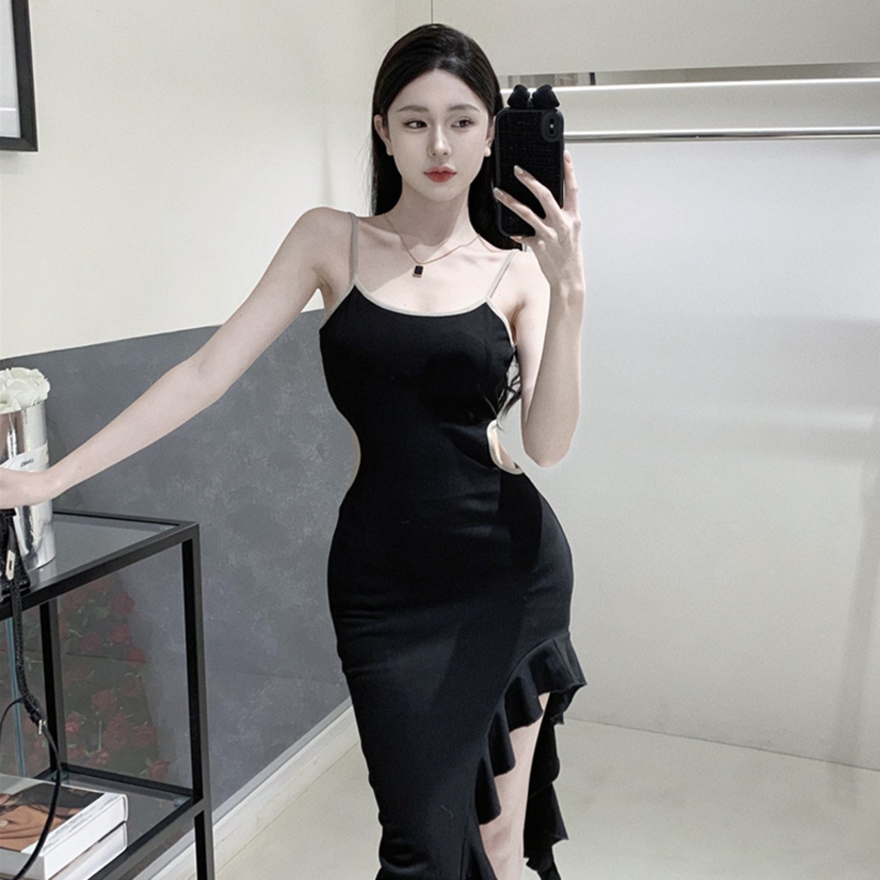 黒のイブニングドレスの女性のハイエンドの軽い豪華なニッチハイエンドのセクシーな中空バックレス不規則なサスペンダードレス ブラック yeyij61843289978