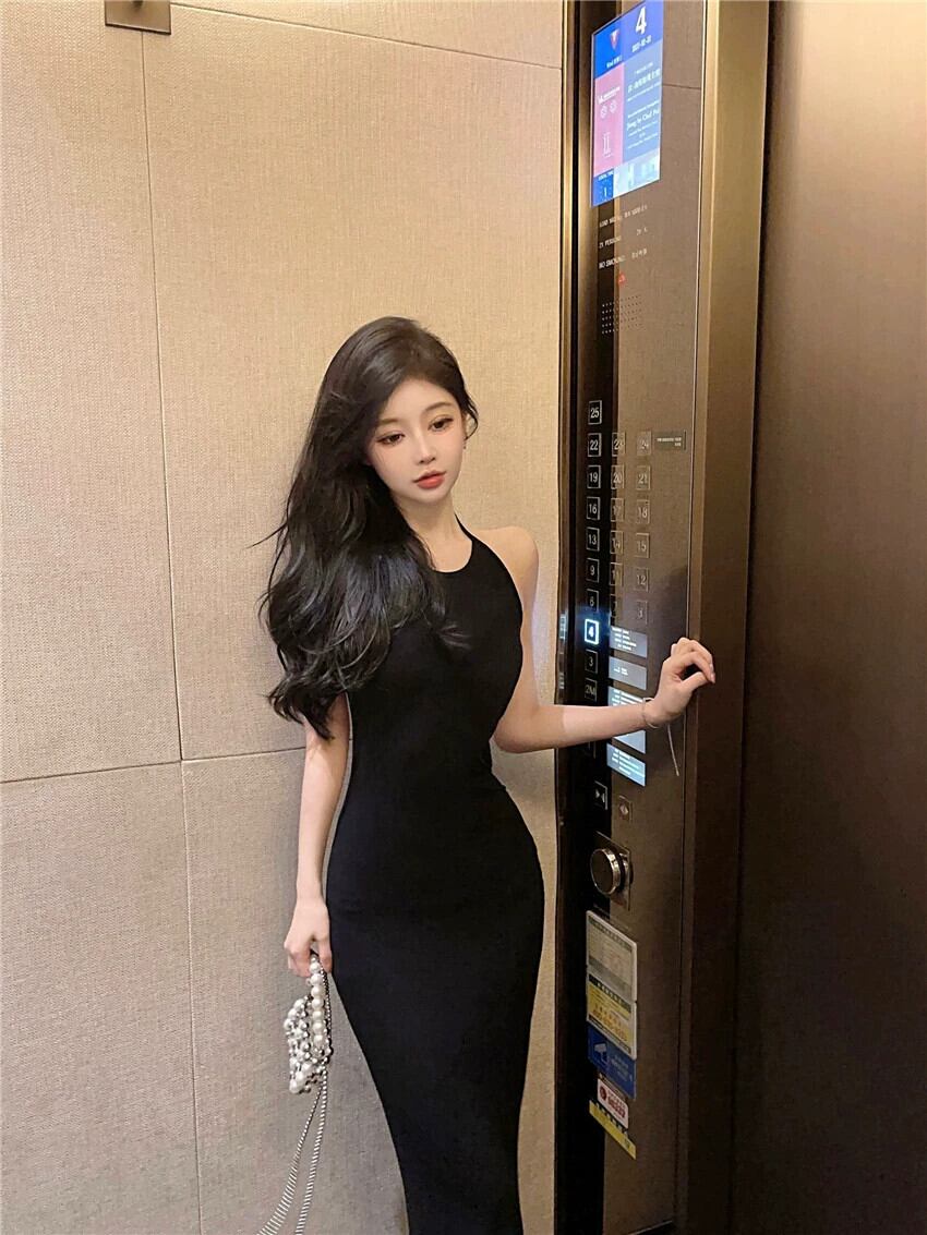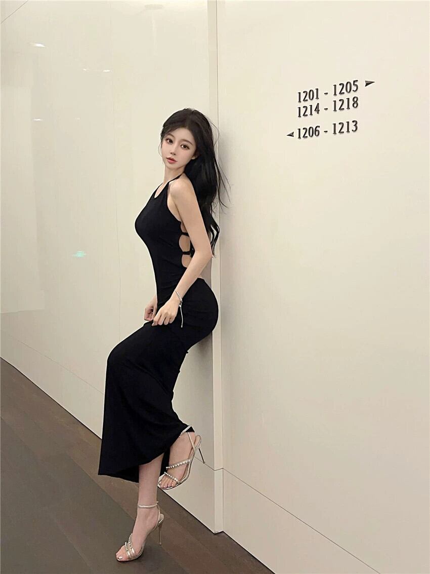 黒のイブニングドレスロングスカート女性のハイエンド感覚宴会パーティー気質自己修養セクシーな背中の開いたホルターネックドレス ブラック yeyij56413790909