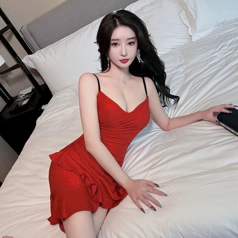 ナイトクラブの女性の夜の作業服技術者作業服赤明るいシルクセクシーな V ネックフィッシュテールサスペンダードレス レッド Vネック yeyij5110734606