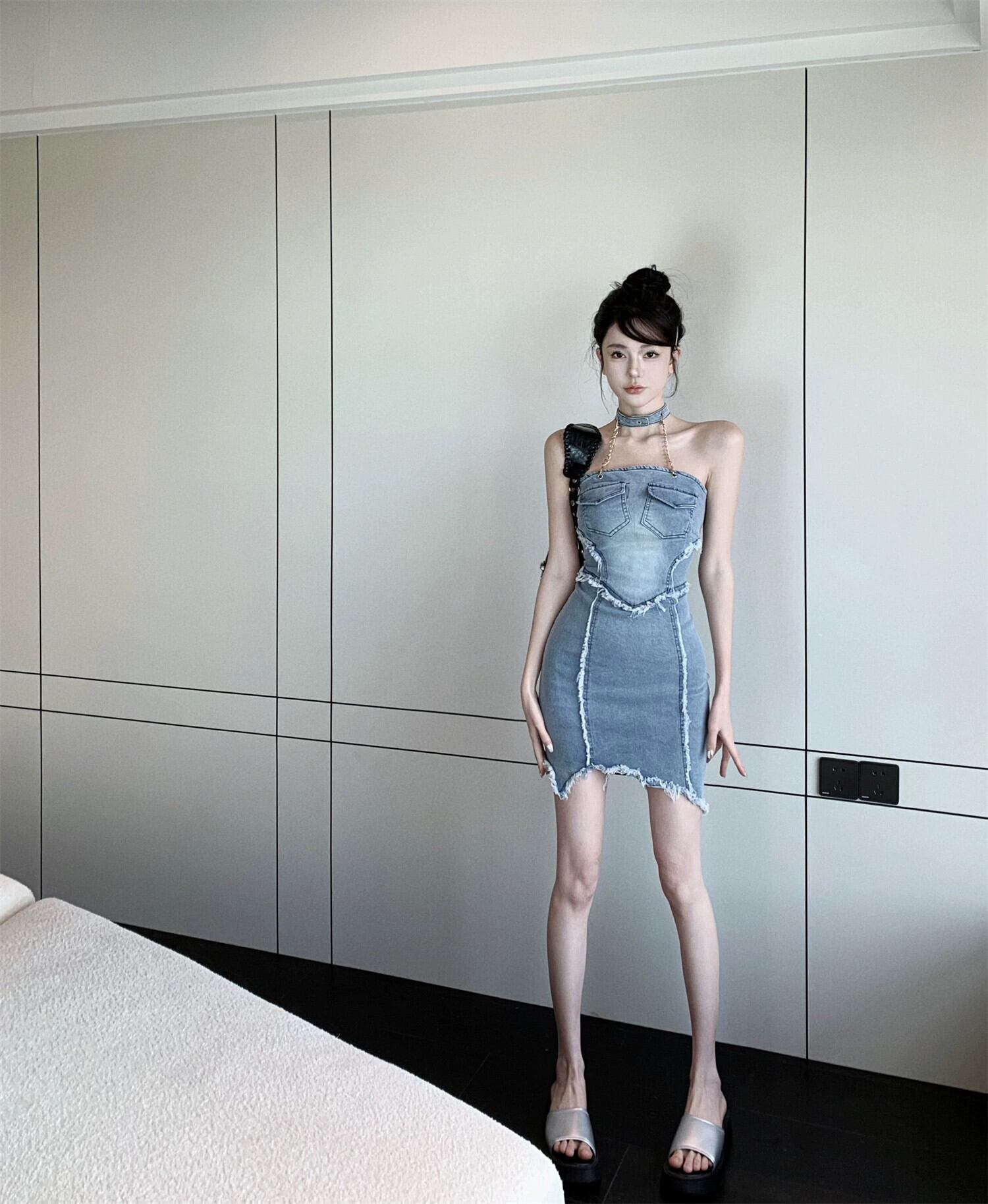 純粋な欲望の甘くてスパイシーなスタイルの女性の夏のセクシーなチェーンタイトバッグヒップステッチウォッシュデニムチューブトップホルターネックドレス 大人ガーリー スウィート キュート カジュアル サマー 夏物 yeyij35967217113