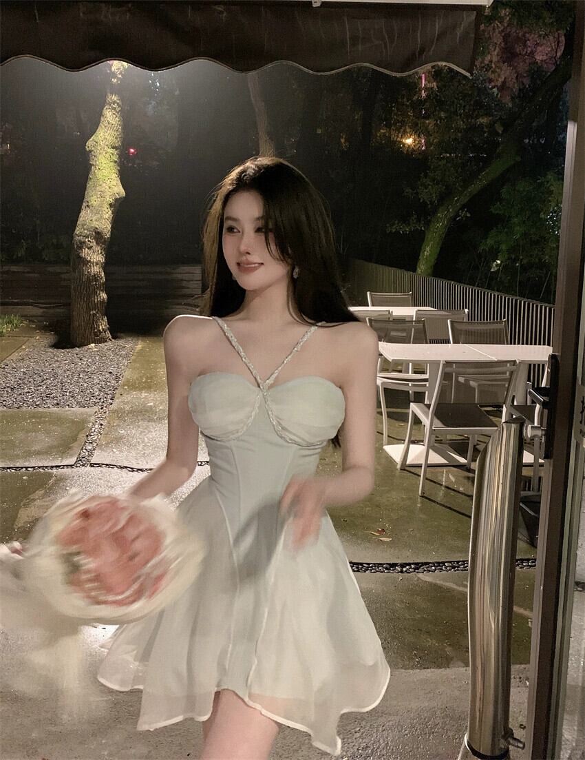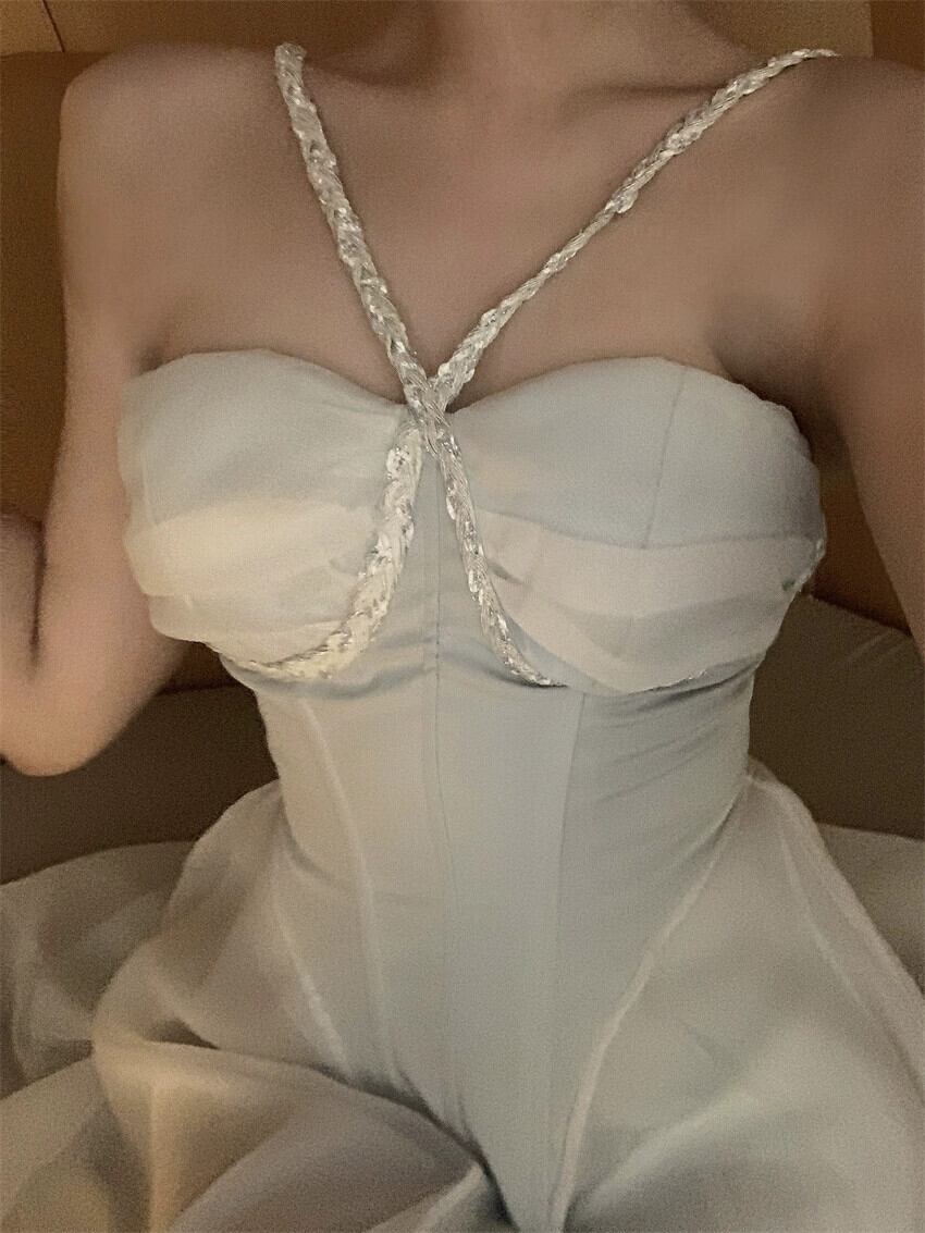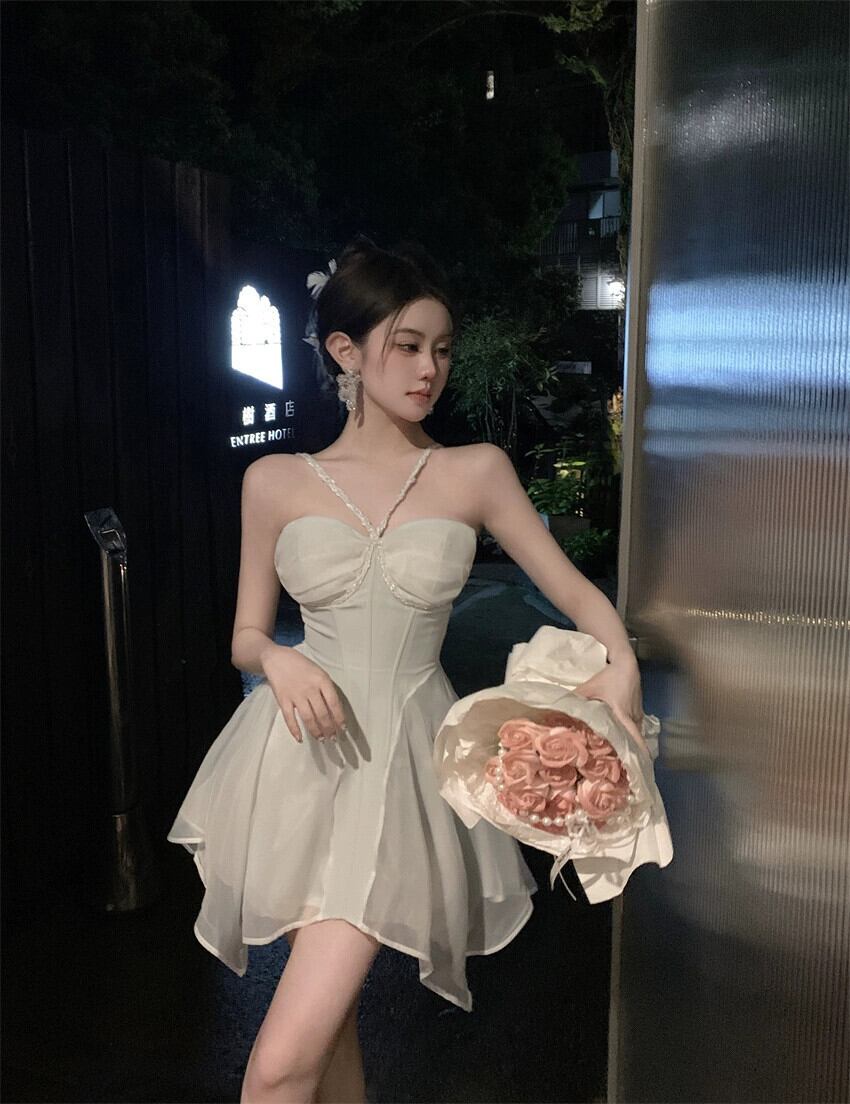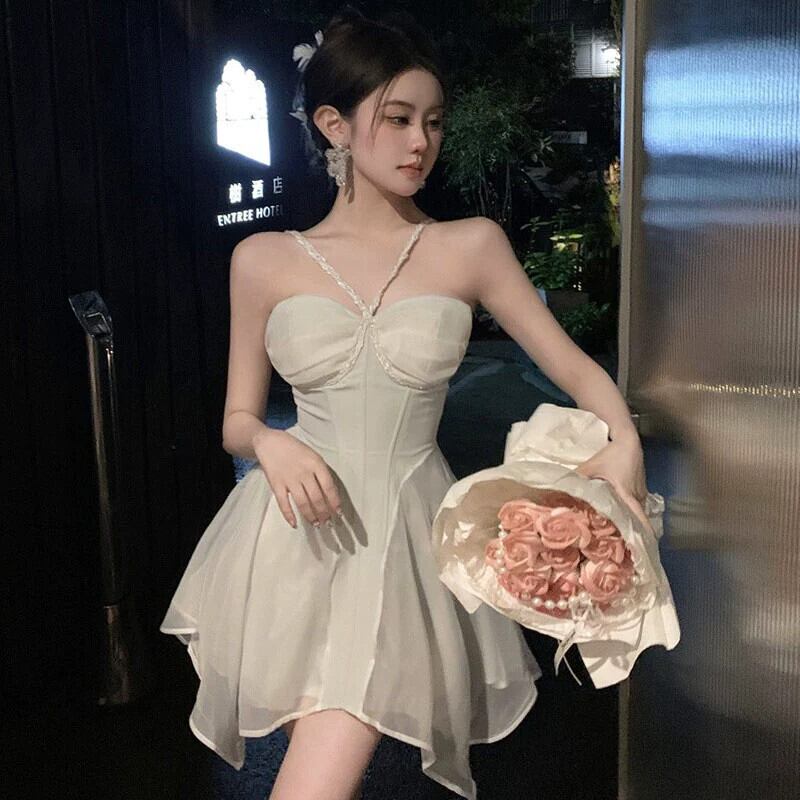 白い誕生日ドレス女性のハイエンドセンスフレンチスーパーフェアリービーチシーサイドホリデーセクシーなふわふわサスペンダードレス ホワイト yeyij51403262146