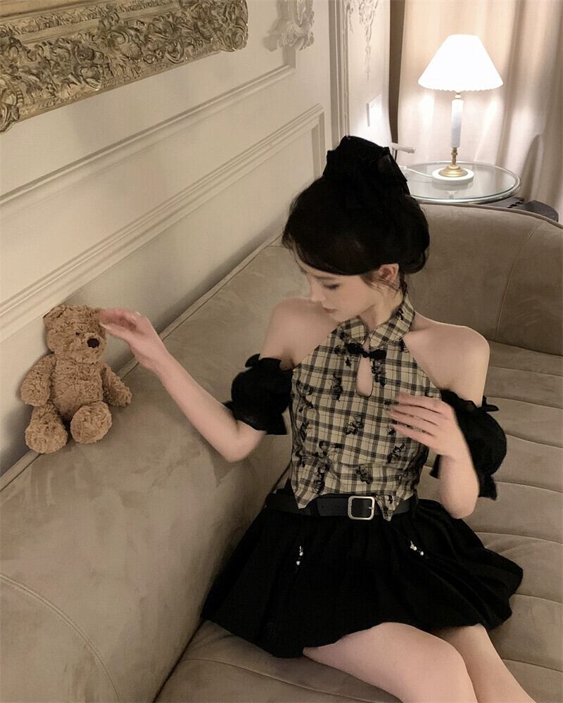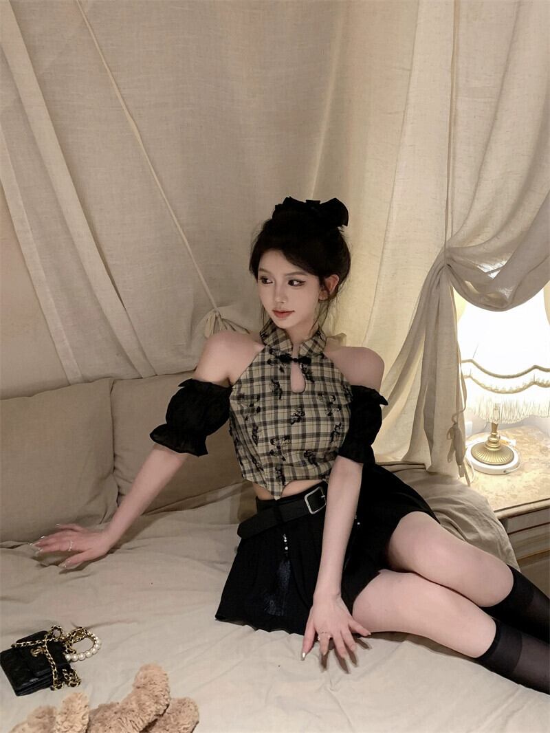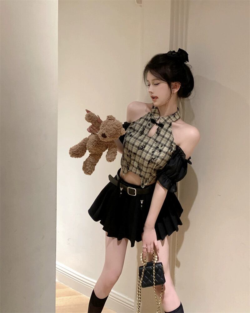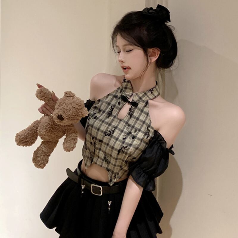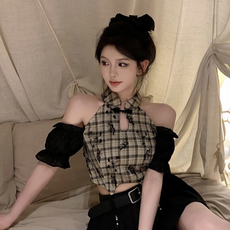 ライブ服女性アンカー服 pogenic ハイエンドチャイナチェック柄シャツセクシーなオフショルダークロップ臍トップ yeyij62731789824